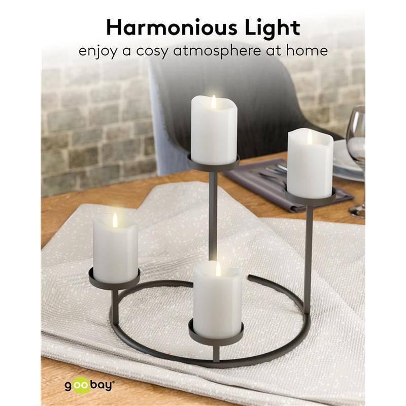 Zestaw 4 świec LED z prawdziwego wosku firmy Goobay doda klasycznego uroku każdej przestrzeni. Wykonane z prawdziwego wosku i wyposażone w stożki płomieni 3D, tworzą pięknie realistyczny efekt migotania, który oddaje ciepło tradycyjnych świec - bez sadzy, ciepła i ryzyka pożaru. Ciepła, biała poświata o temperaturze 2700 K zapewnia przytulną atmosferę odpowiednią do całorocznego wystroju, od kameralnych kolacji po uroczyste obchody Bożego Narodzenia. Dzięki automatycznemu 6-godzinnemu timerowi i zasilaniu bateryjnemu, świece te zapewniają bezproblemową atmosferę wszędzie tam, gdzie prawdziwe płomienie mogą być niebezpieczne lub niedozwolone.