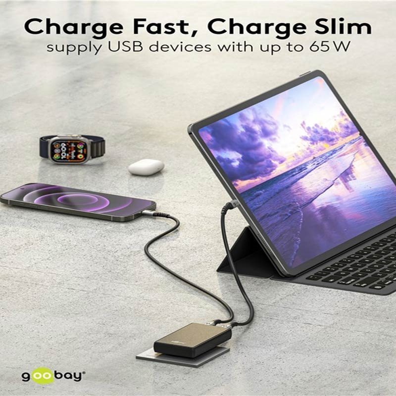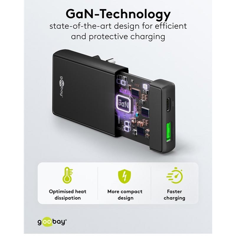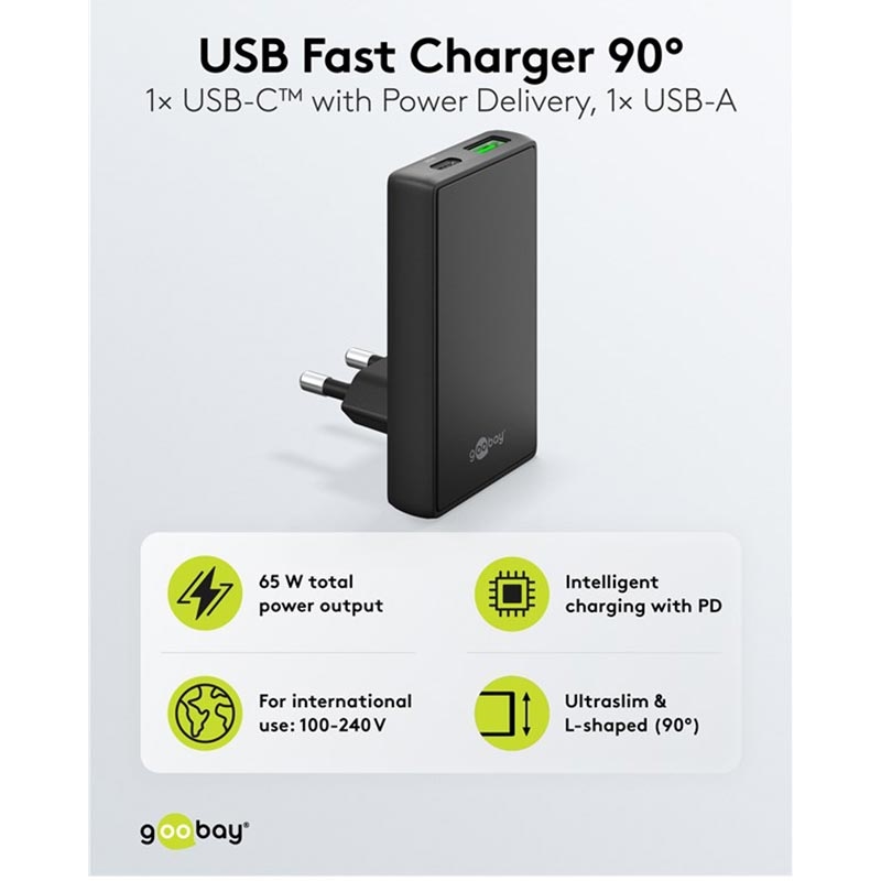 Goobay GaN Podwójna szybka ładowarka 90° płaska 65W - ultrasmukła ładowarka ścienna z portami USB-C i USB-A