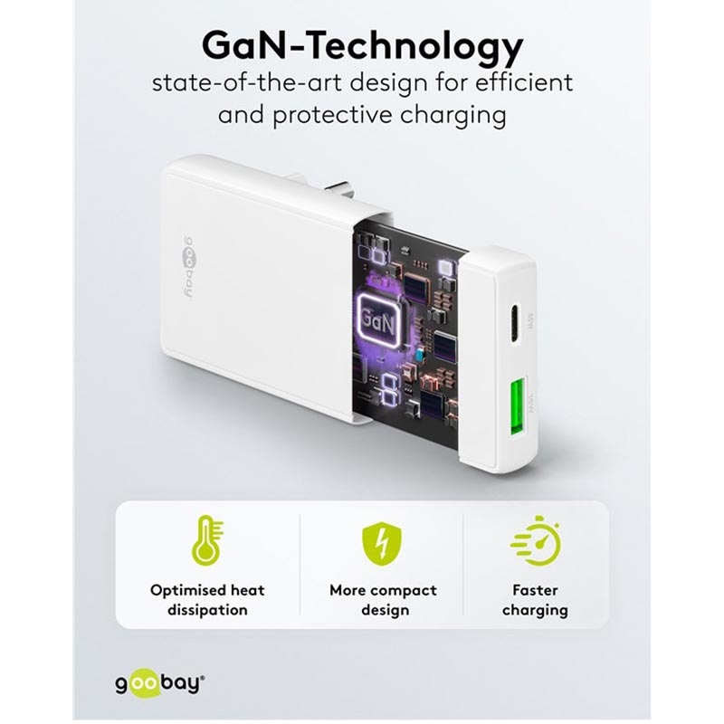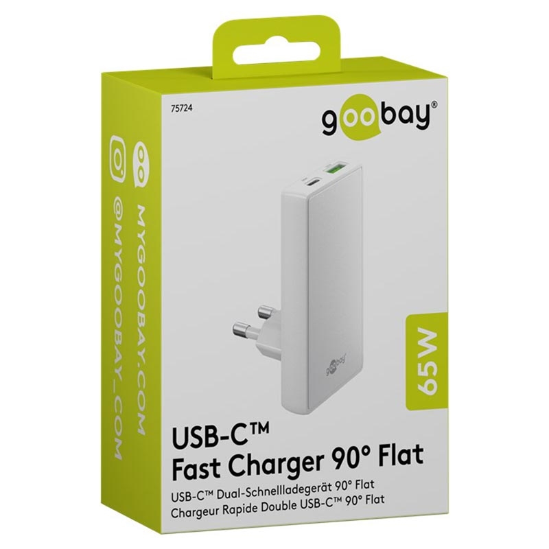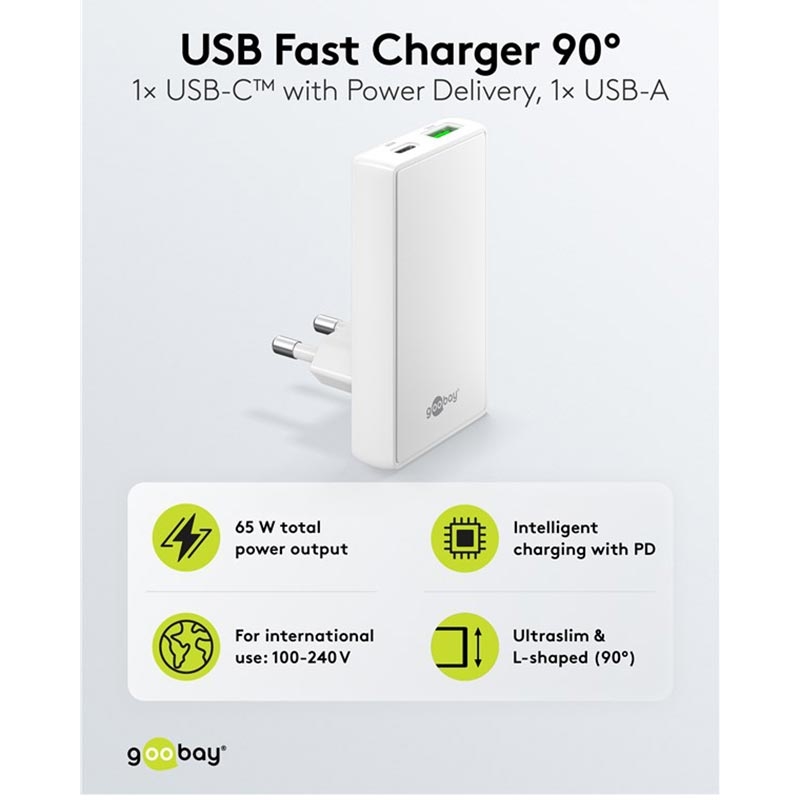 Goobay GaN Podwójna szybka ładowarka 90° płaska 65W - ultrasmukła ładowarka ścienna z portami USB-C i USB-A