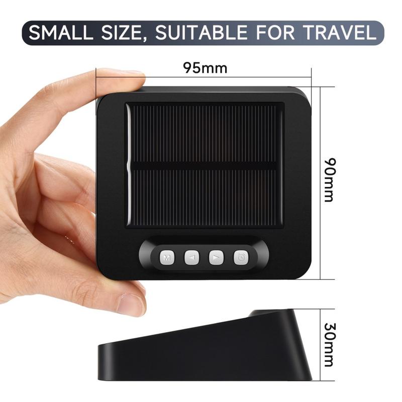 Cyfrowy budzik LED GS-301 zasilany energią słoneczną to kompaktowy, przyjazny w podróży zegar, który wyświetla godzinę, datę, dzień tygodnia i temperaturę na wyraźnym ekranie LED o wysokiej rozdzielczości. Obsługuje podwójne zasilanie (ładowanie słoneczne oraz ładowanie przez USB typu C), co zapewnia niezawodne działanie w różnych środowiskach, od samochodu po stolik nocny lub kemping. Dzięki podwójnym alarmom, przełączaniu formatu 12/24-godzinnego, 5-minutowej funkcji drzemki i wbudowanemu przypomnieniu o zmęczeniu podczas jazdy, jest to inteligentny wybór do codziennych czynności i długich podróży.