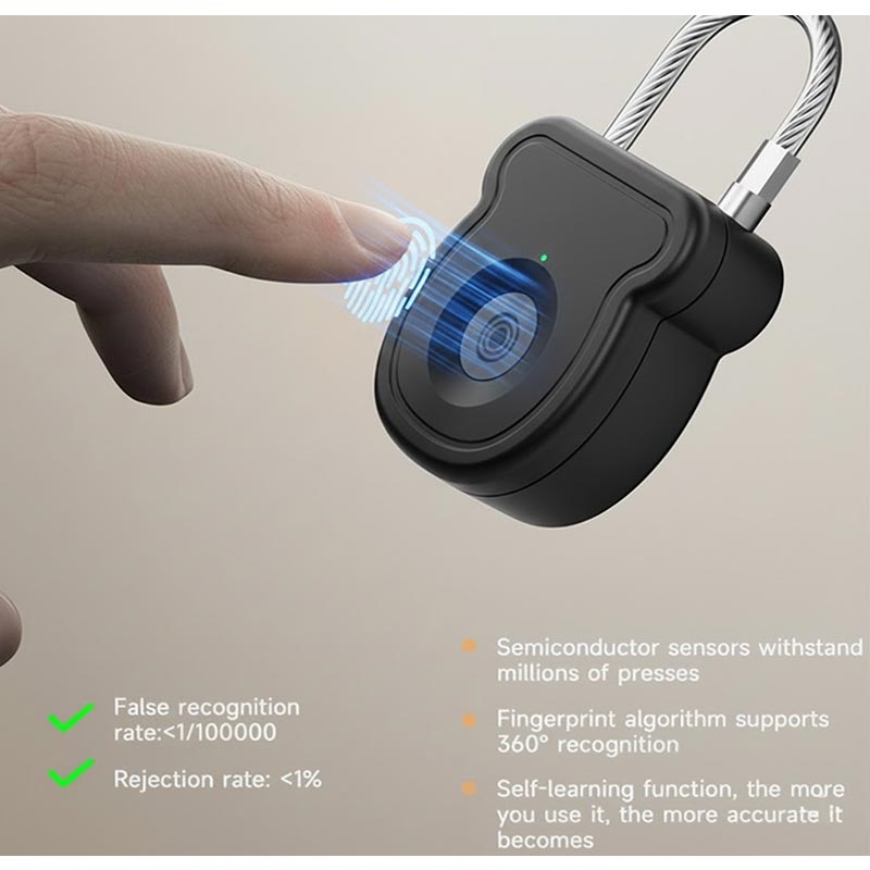 Ta inteligentna kłódka wykorzystuje półprzewodnikowy czujnik linii papilarnych, który może przechowywać do 20 odcisków palców. Samouczący się algorytm z czasem poprawia dokładność, zapewniając szybsze i bardziej niezawodne odblokowywanie przy każdym użyciu.