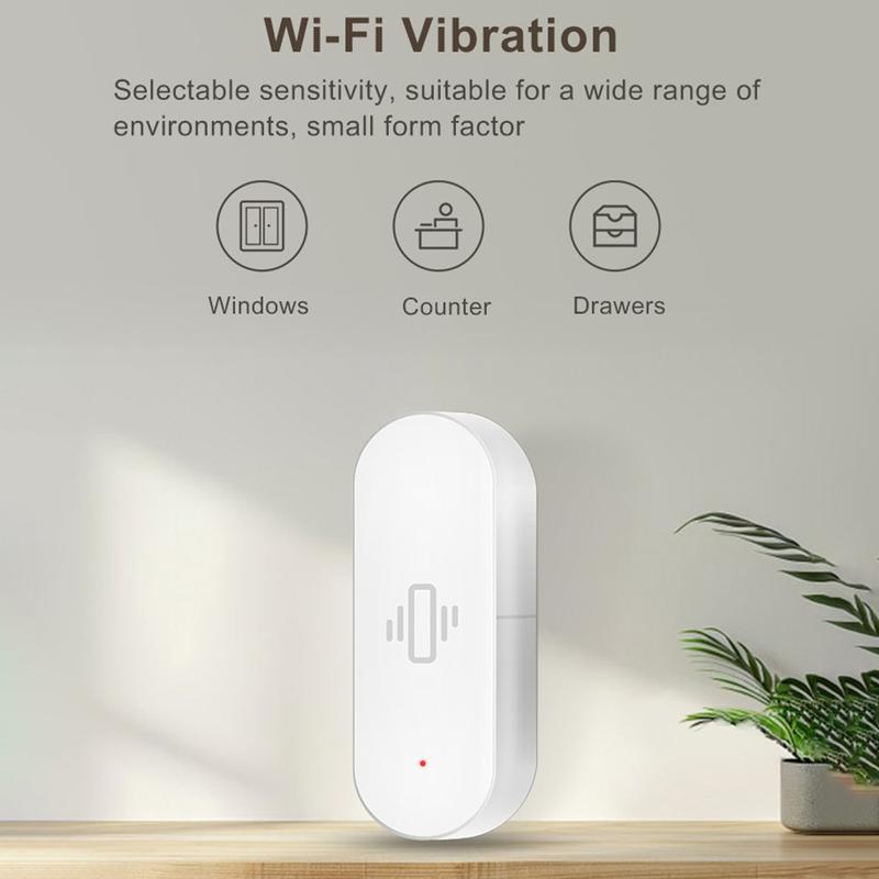 Ten czujnik wymaga stabilnego połączenia WiFi 2,4 GHz i baterii AAA (nie dołączonej do zestawu). Aby uzyskać najlepsze wyniki, zamontuj go mocno na powierzchni, którą chcesz monitorować, i przetestuj ustawienia czułości, aby uniknąć fałszywych alarmów.