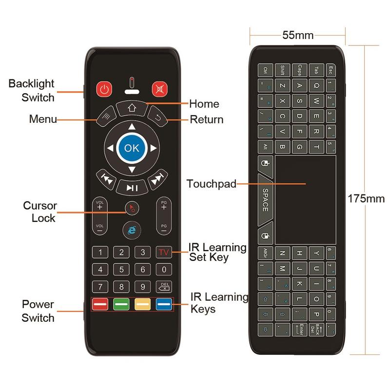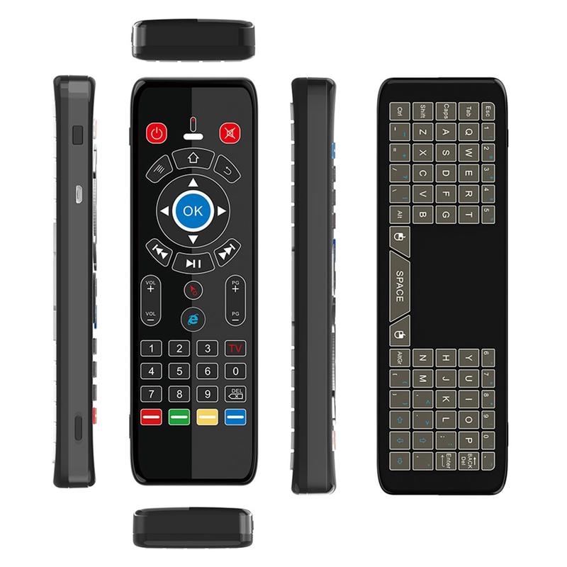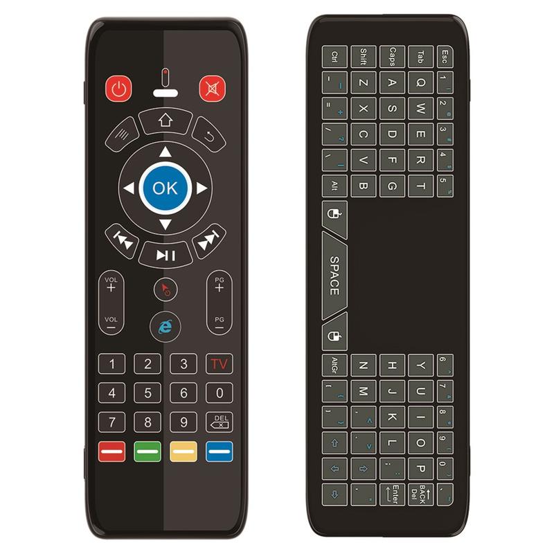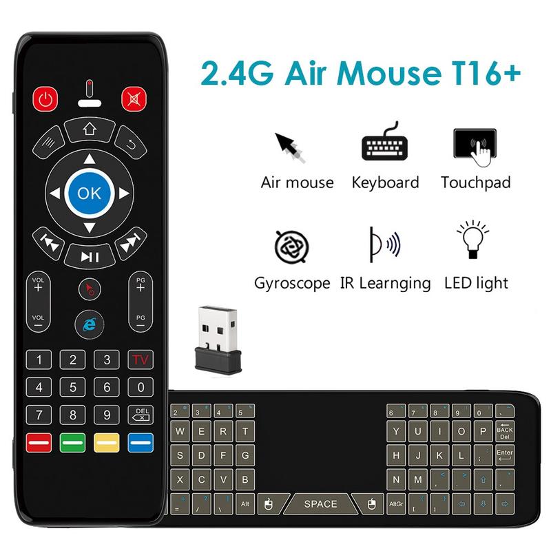 Bezprzewodowy pilot T16+ łączy w sobie wiele metod sterowania w jednym kompaktowym urządzeniu: mysz powietrzna z żyroskopem, touchpad, pełna klawiatura QWERTY i 5-przyciskowe programowanie podczerwieni. Został zaprojektowany, aby zastąpić kilka kontrolerów i uprościć nawigację między urządzeniami inteligentnymi.
