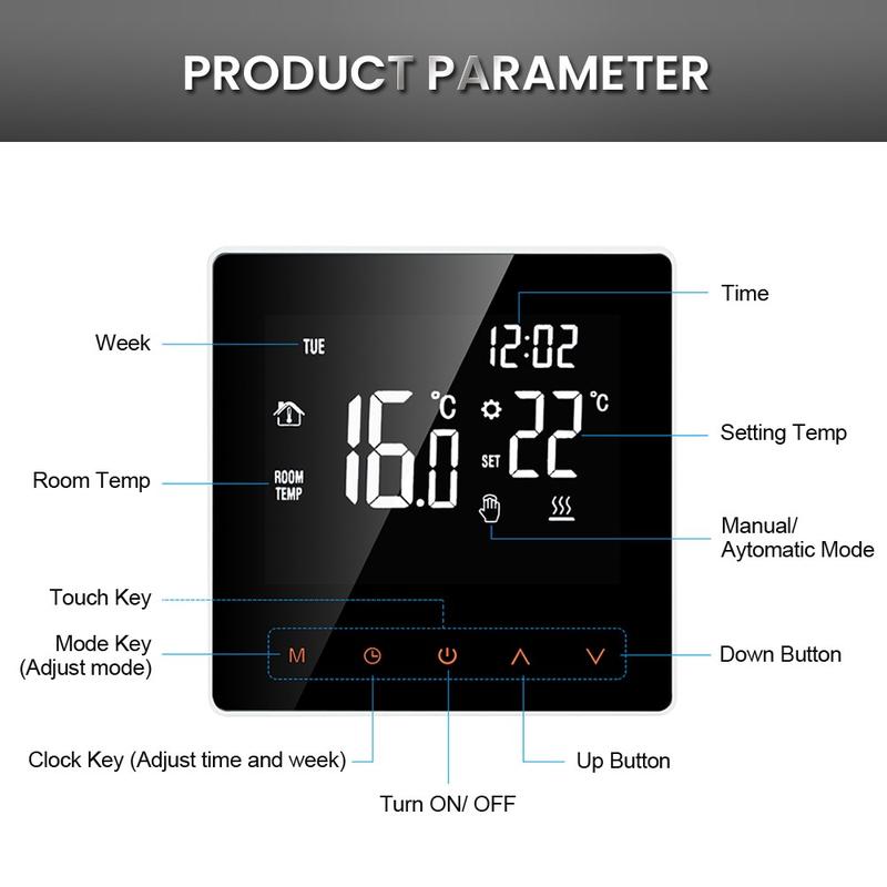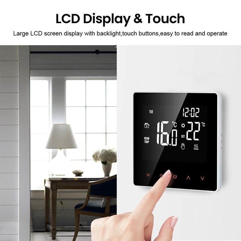 Duży ekran dotykowy LCD z podświetleniem jest czytelny zarówno w dzień, jak i w nocy. Elegancka, jednoczęściowa konstrukcja nadaje termostatowi schludny i nowoczesny wygląd, a powierzchnia odporna na zarysowania pomaga zachować jego estetyczny wygląd przez długi czas. W zależności od codziennej rutyny i osobistych preferencji można wybierać między trybem ręcznym do bezpośredniej regulacji a trybem automatycznym do programowanego ogrzewania.
