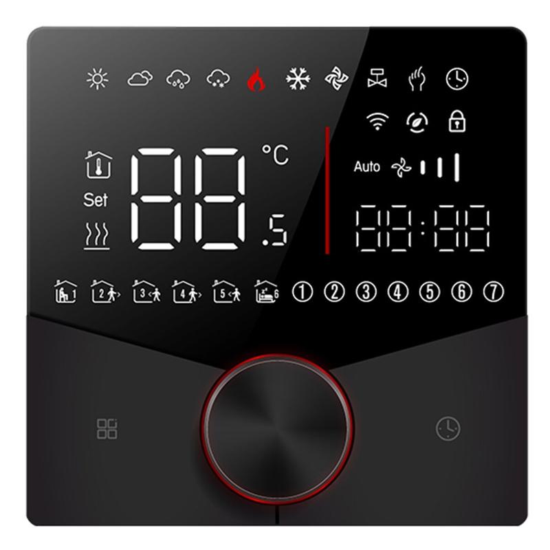 Elegancki wyświetlacz LCD i pojemnościowe przyciski dotykowe zapewniają płynny i przyjazny dla użytkownika interfejs. Ultracienki wbudowany panel, bezramkowa konstrukcja i zaokrąglone rogi sprawiają, że urządzenie idealnie wtapia się w nowoczesne wnętrza. Niezależnie od tego, czy zostanie zainstalowany w domu, hotelu czy biurze, termostat ten oferuje czysty i minimalistyczny wygląd, pozostając jednocześnie prostym w codziennym użytkowaniu.