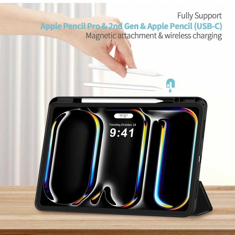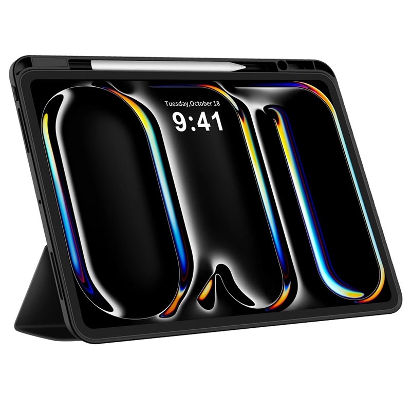 Akordeonowa osłona z przodu zapewnia dodatkową ochronę wyświetlacza, a zintegrowana technologia pozwala na automatyczne wybudzanie i usypianie urządzenia, pomagając oszczędzać baterię. Dodatkowo, etui pełni funkcję podstawki, pozwalając na wygodne i komfortowe korzystanie z iPad Pro 11 (2024), iPad Pro 11 (2025).