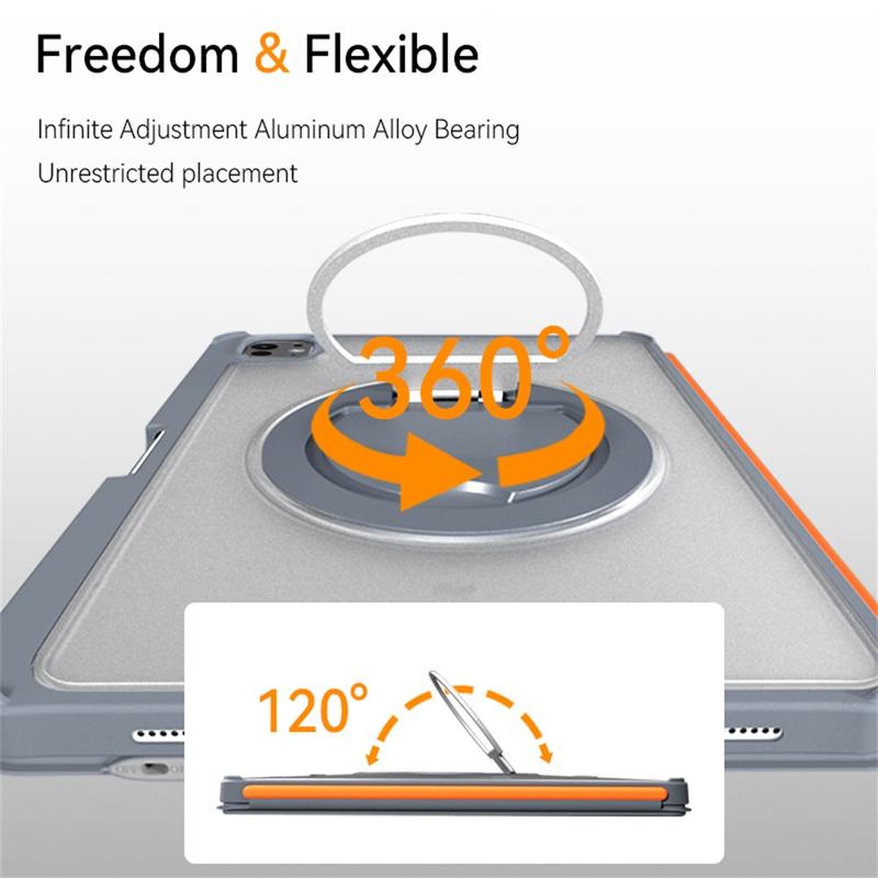 - Obrotowa podstawka 360° - Wyposażona we wzmocniony zawias ze stopu aluminium, ta podstawka oferuje płynny obrót o 360° i wiele stabilnych kątów widzenia - idealna do pisania, szkicowania lub rozmów wideo.