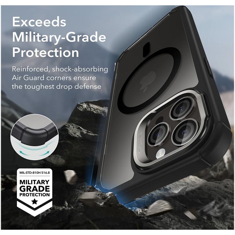 - Wzmocnione pochłaniającymi narożnikami Air Guard - Certyfikat Military Grade (MIL-STD-810H 516.9)