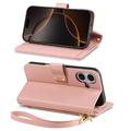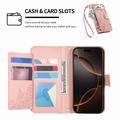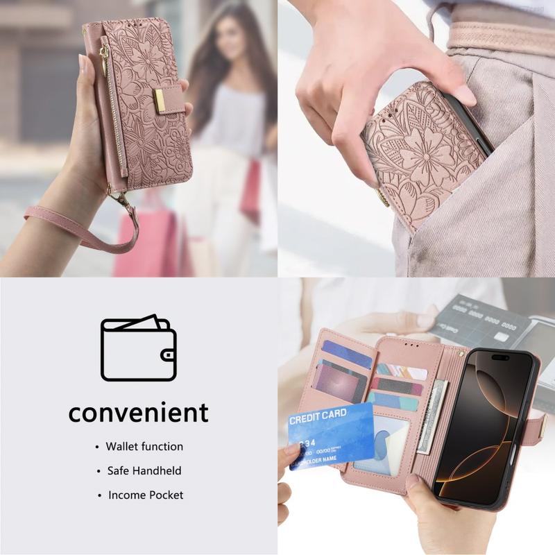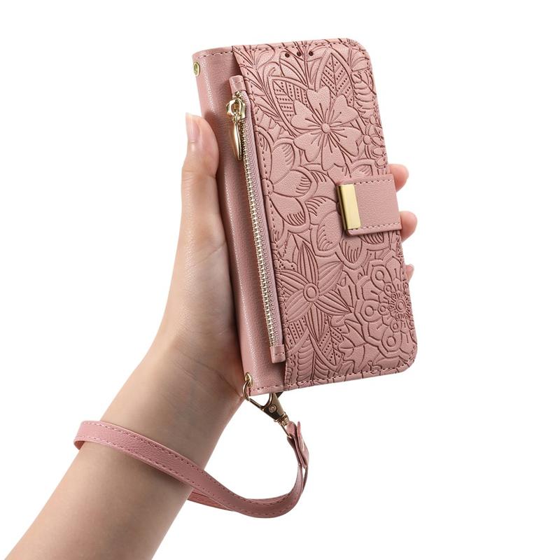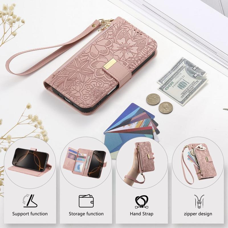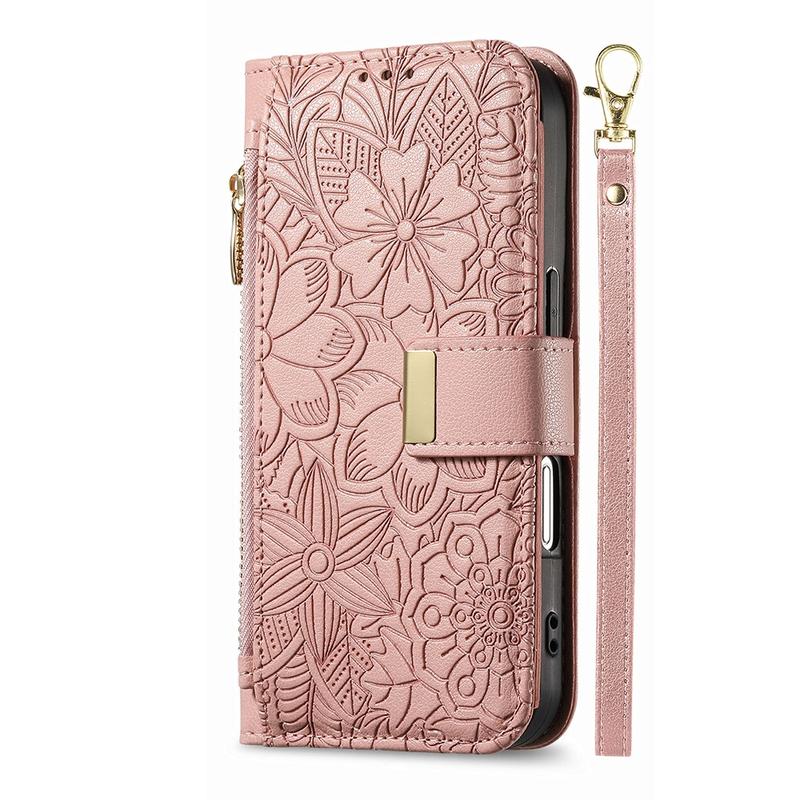 Etui na portfel z wzorem kwiatów i liści, kieszenią na suwak i paskiem na nadgarstek do iPhone 16