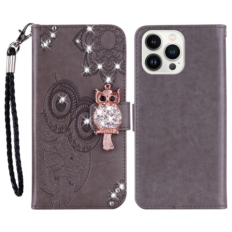 Etui na portfel z motywem sowy i kryształkami dla iPhone 16 Pro