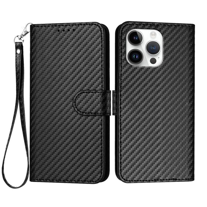 Etui portfelowe premium z paskiem do iPhone 16 Pro Max - tekstura włókna węglowego