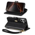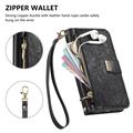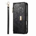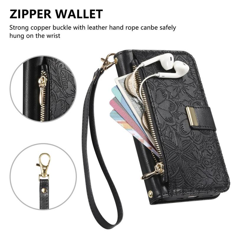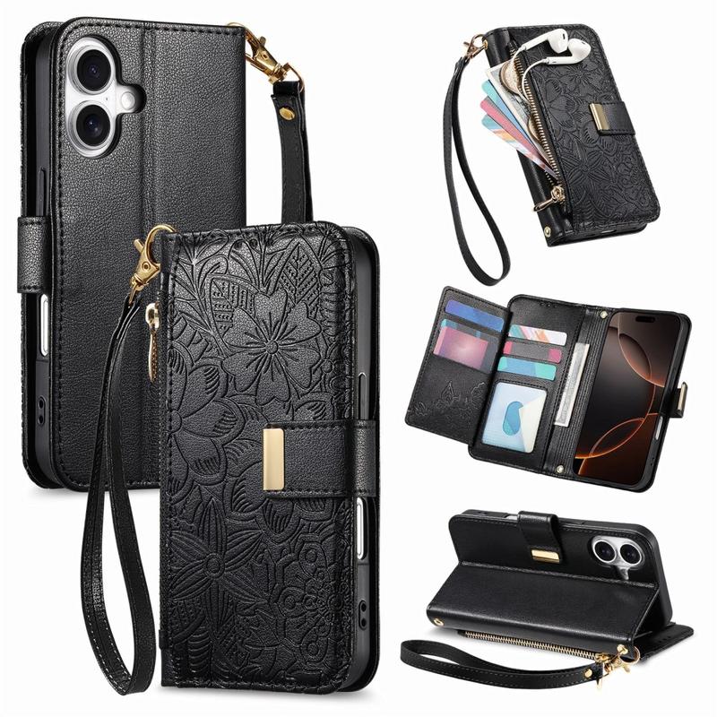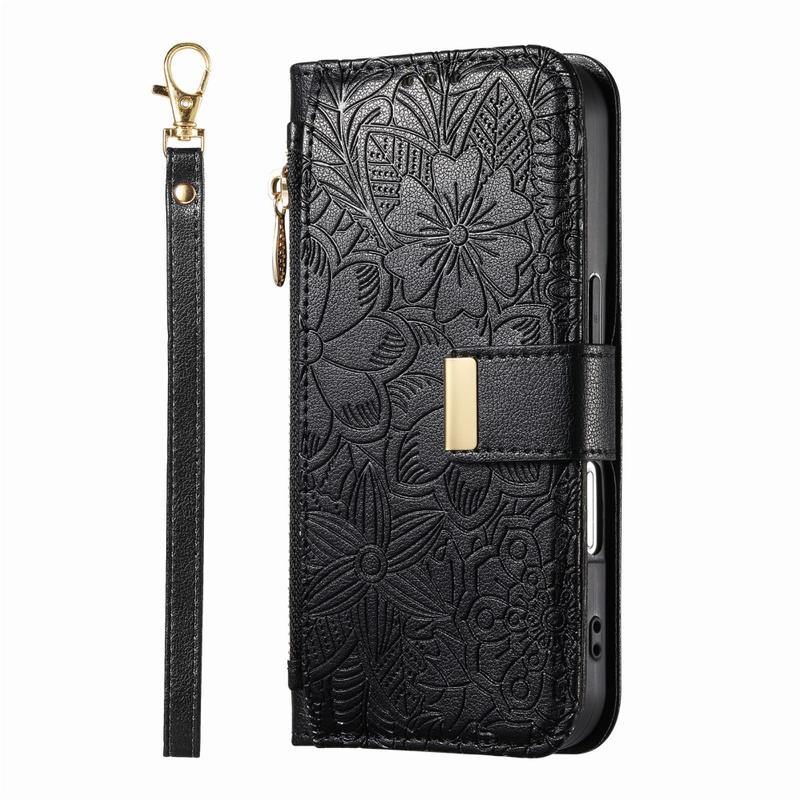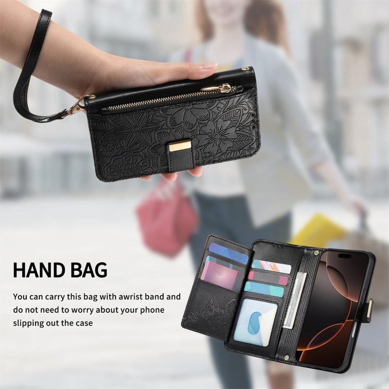 Etui na portfel z wzorem kwiatów i liści, kieszenią na suwak i paskiem na nadgarstek do iPhone 17