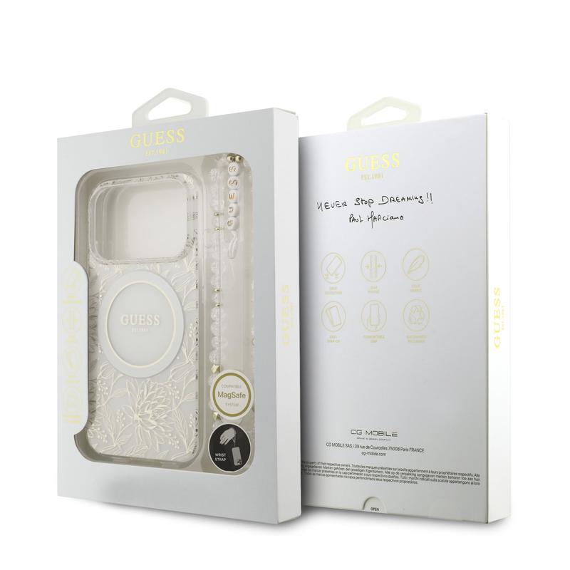 Etui z perłowym paskiem Guess IML Flowers Allover Electro do iPhone 17 Pro - kompatybilne z MagSafe