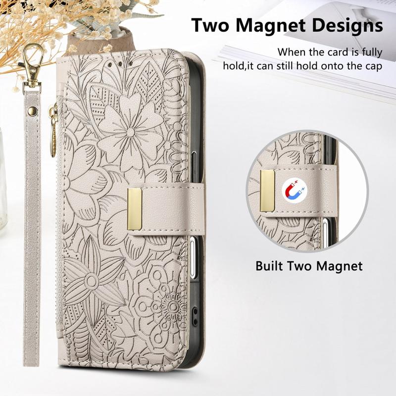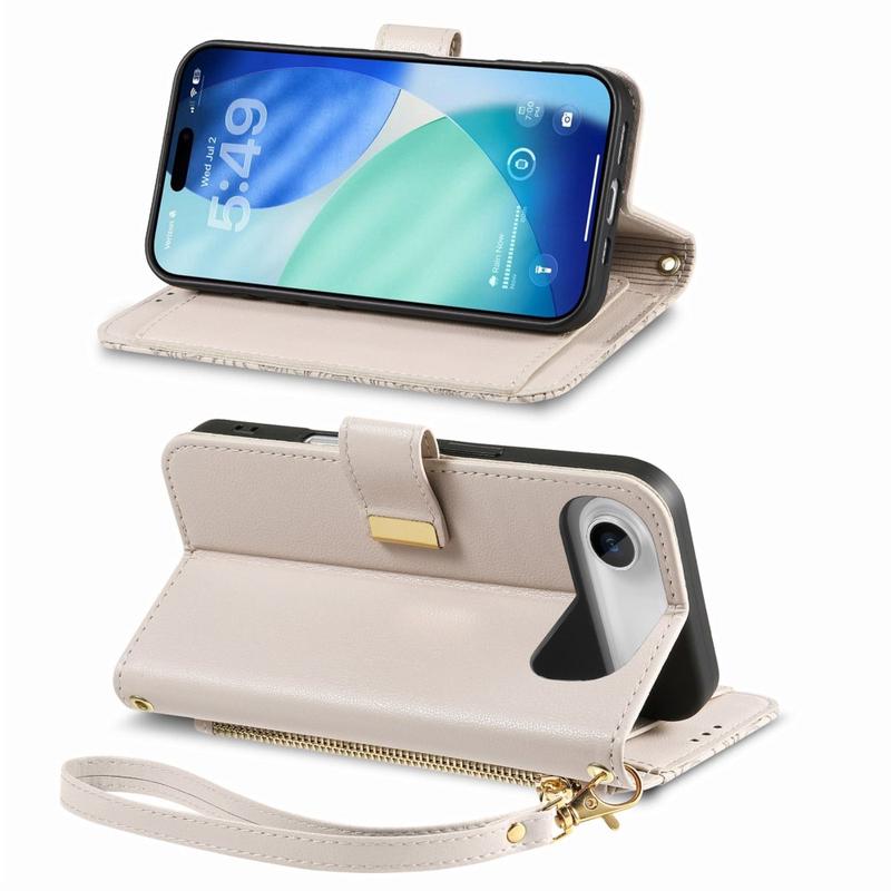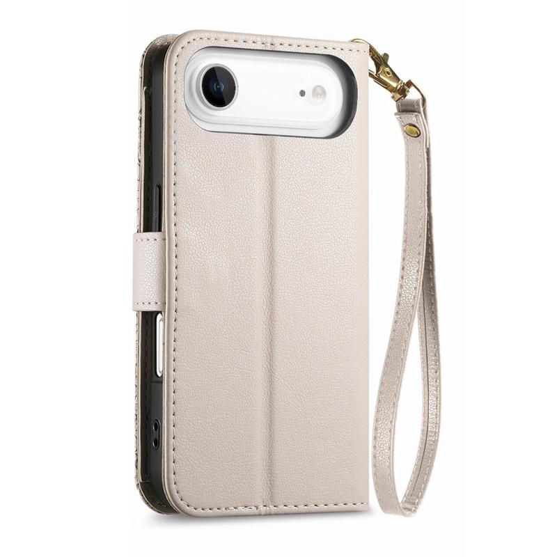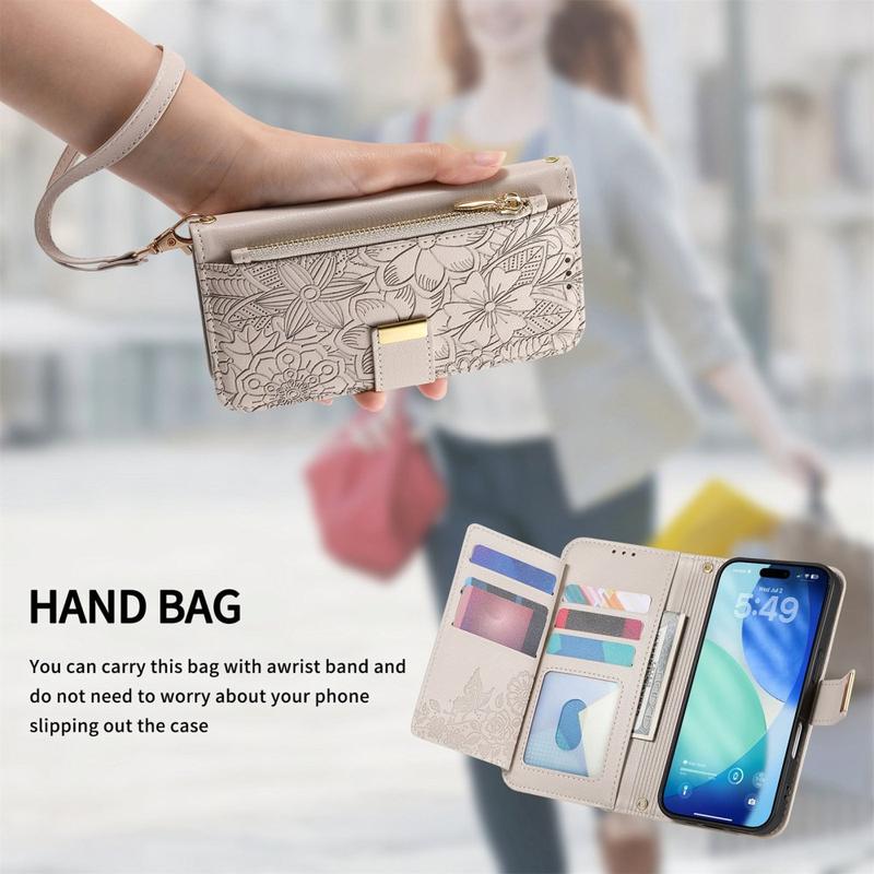 Etui na portfel z wzorem kwiatów i liści, kieszenią na suwak i paskiem na nadgarstek do iPhone Air