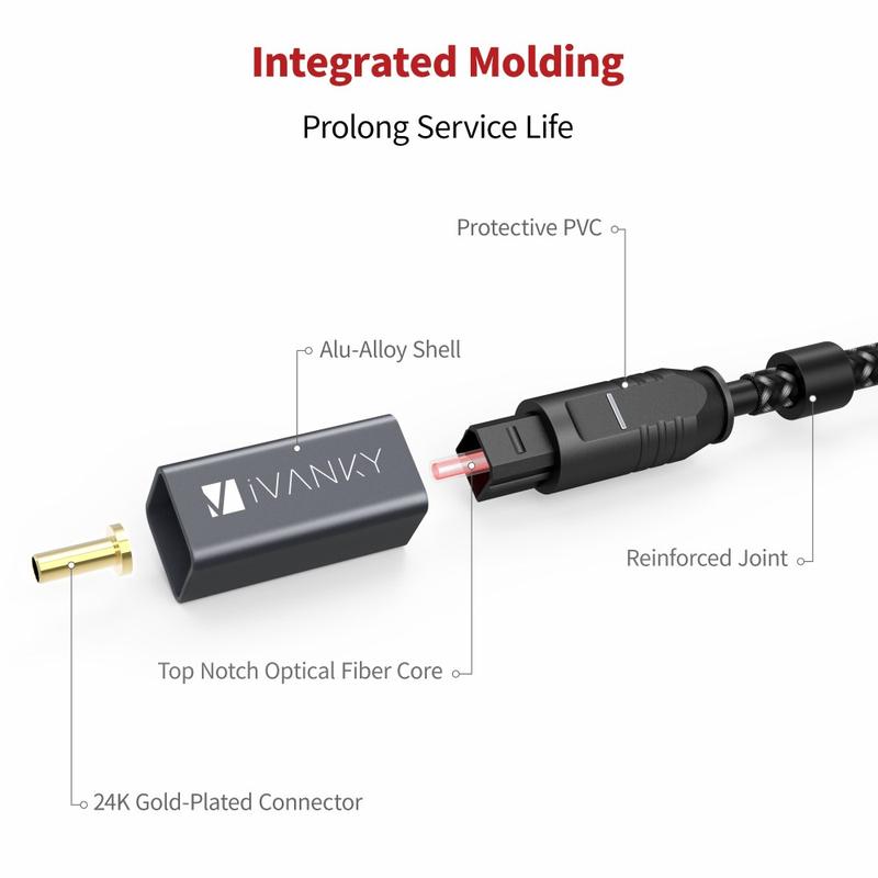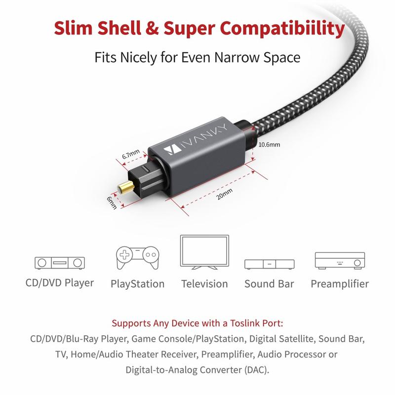 Ciesz się czystym, pozbawionym zakłóceń dźwiękiem dzięki optycznemu kablowi audio IVANKY OC03 Toslink. Zbudowany z myślą o niezawodnej cyfrowej transmisji dźwięku, ten 3-metrowy kabel światłowodowy jest idealny do podłączenia telewizora do soundbara, amplitunera AV, systemu kina domowego lub konsoli do gier. Smukła obudowa złącza idealnie pasuje do ciasnych przestrzeni, a obudowa ze stopu aluminium zapewnia trwałość w codziennym użytkowaniu. Elastyczny nylonowy oplot zapobiega plątaniu i zaginaniu się kabla, a dołączone do zestawu zdejmowane gumowe zaślepki chronią złącza, gdy kabel nie jest używany. Wystarczy podłączyć, aby uzyskać mocne, stabilne połączenie i wyraźny cyfrowy dźwięk.