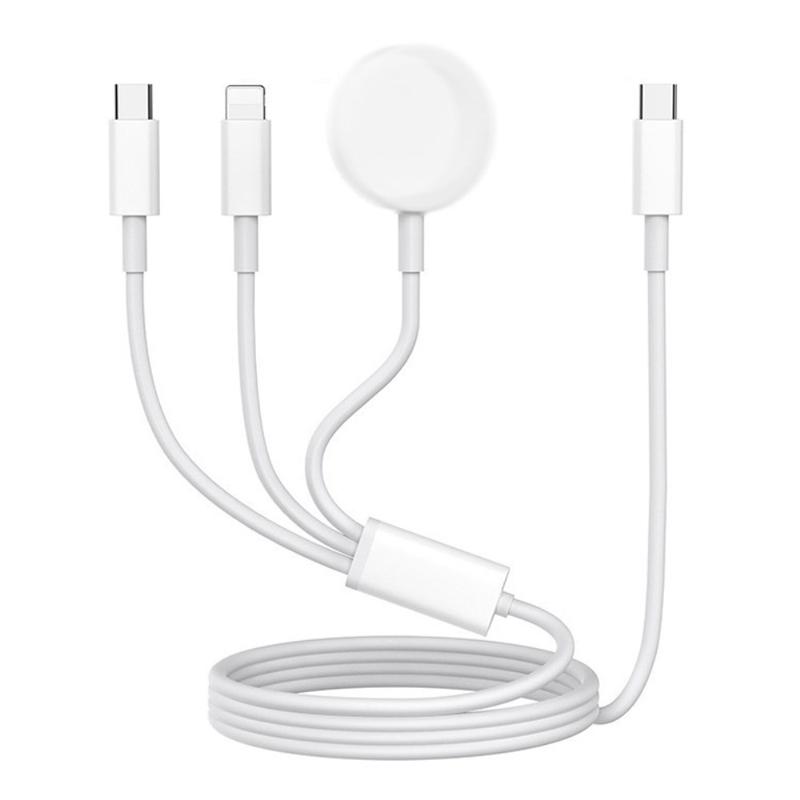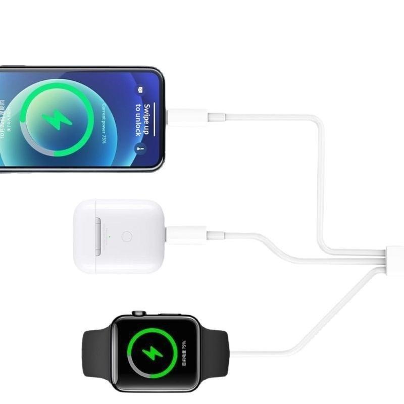 Kabel do ładowania 3 w 1 został zaprojektowany, aby uprościć codzienne ładowanie, łącząc wiele funkcji w jednym praktycznym kablu. Obsługuje bezprzewodowe ładowanie zegarka Apple Watch, dzięki czemu jest idealnym rozwiązaniem na biurko, stolik nocny i w podróży.