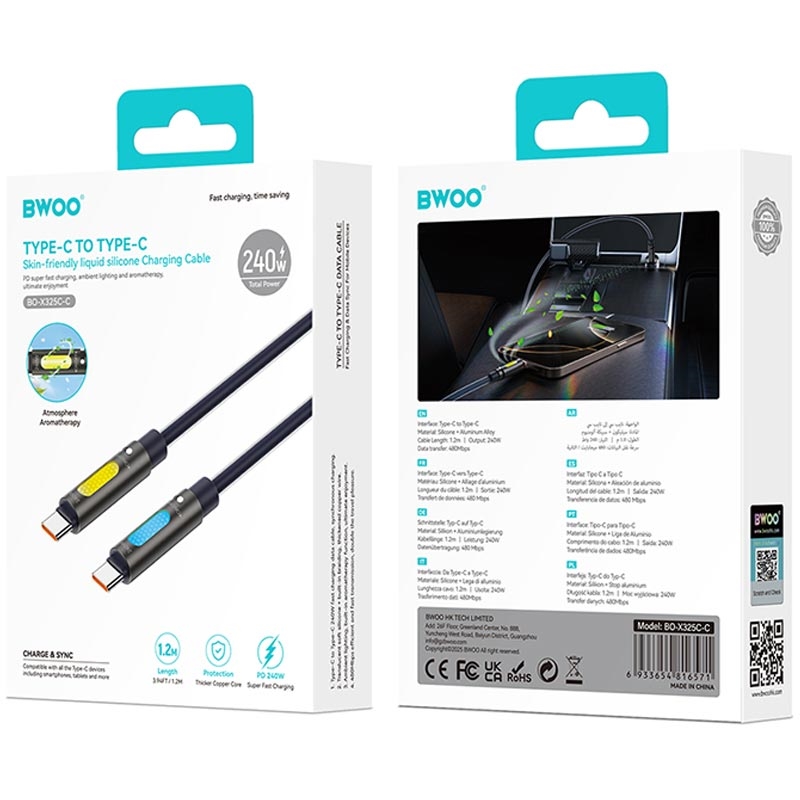 Kabel ładujący BWOO USB-C do USB-C do aromaterapii 240 W 1,2 m - podświetlenie RGB, płynny silikon, 480 Mb/s