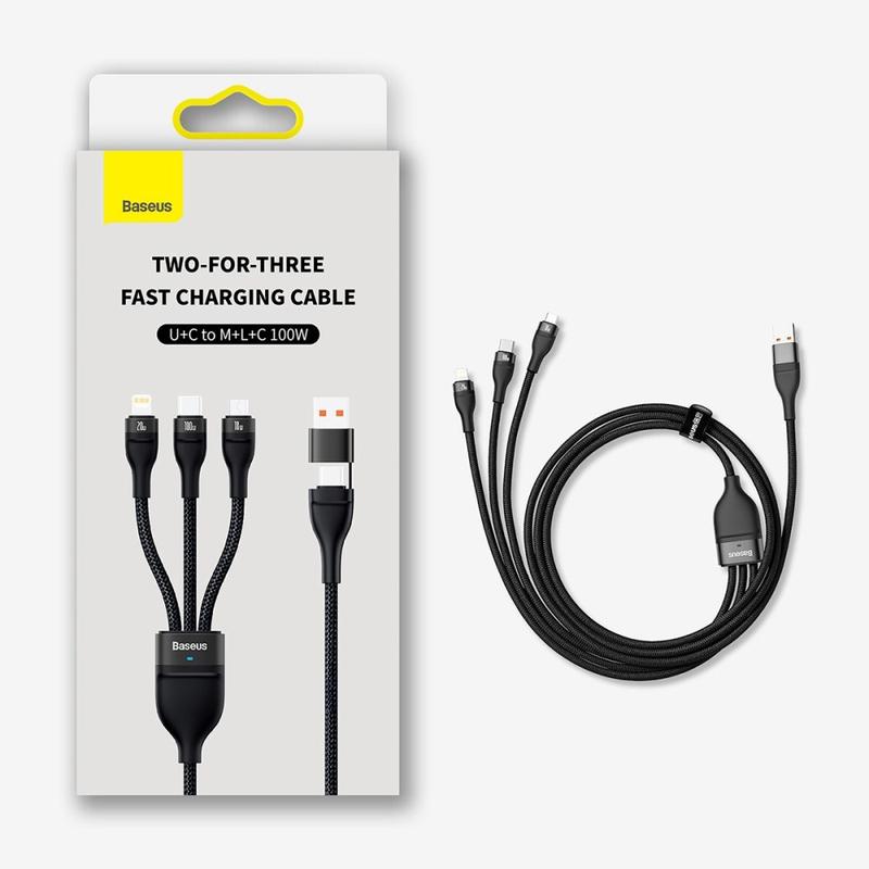 Ładuj więcej urządzeń przy użyciu mniejszej liczby kabli dzięki szybkiemu kablowi ładującemu Baseus Flash Series 3-in-2. Ten inteligentny kabel z wieloma złączami posiada podwójne wejście (USB-A i USB-C) oraz trzy wyjścia (USB-C, Lightning i Micro USB), co zapewnia szeroką kompatybilność z telefonami, tabletami, akcesoriami i innymi urządzeniami. Wbudowane układy rozpoznawania pomagają bezpiecznie rozdzielać prąd i napięcie, a diody LED wskazują stan szybkiego ładowania. Wytrzymała nylonowa pleciona powłoka i wzmocniona konstrukcja sprawiają, że jest to niezawodny kabel do codziennego użytku w domu, biurze, podróży lub samochodzie.