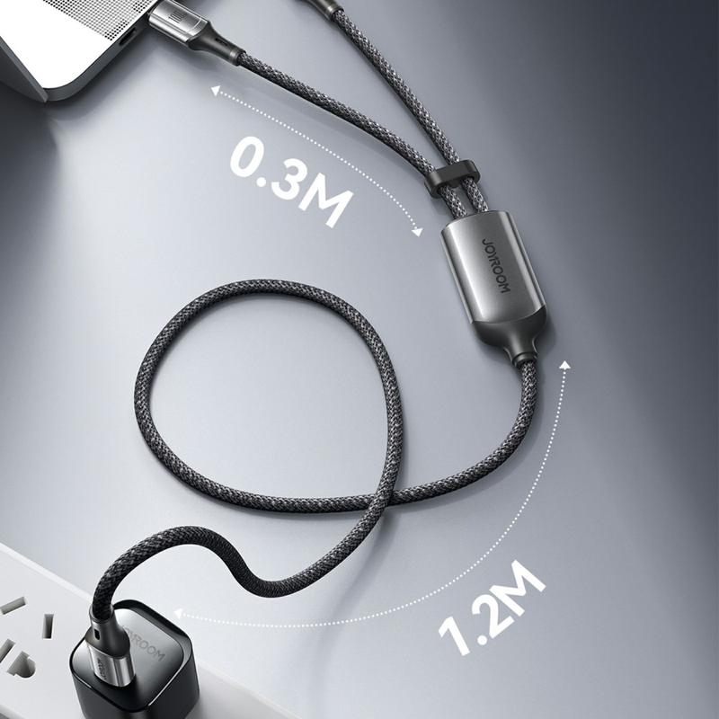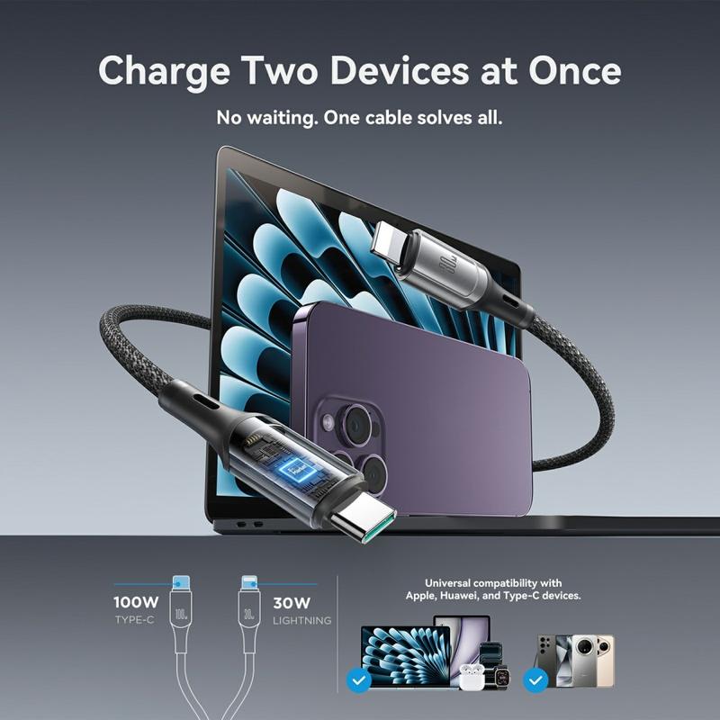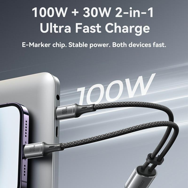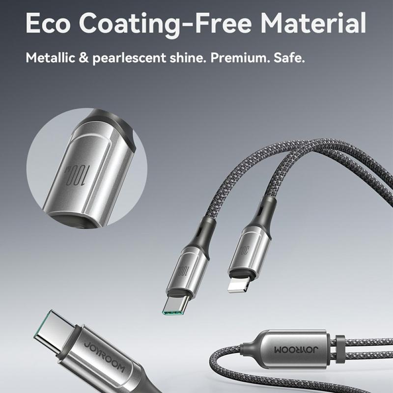 Ładuj i synchronizuj więcej urządzeń za pomocą jednego inteligentnego kabla. Dwuzłączowy kabel ładujący JOYROOM S-A57 łączy USB-C z USB-C z dodatkowym złączem Lightning, zapewniając elastyczną kompatybilność z różnymi urządzeniami bez konieczności noszenia wielu kabli. Obsługuje szybkie ładowanie do 100 W na kompatybilnych urządzeniach USB-C i oferuje transfer danych do 480 Mb / s do codziennej synchronizacji. Zbudowany z wytrzymałego nylonowego oplotu i obudowy złącza ABS, długość 1.5m jest idealna na biurko, sofę i w podróży - zapewniając wygodny zasięg bez plątania.