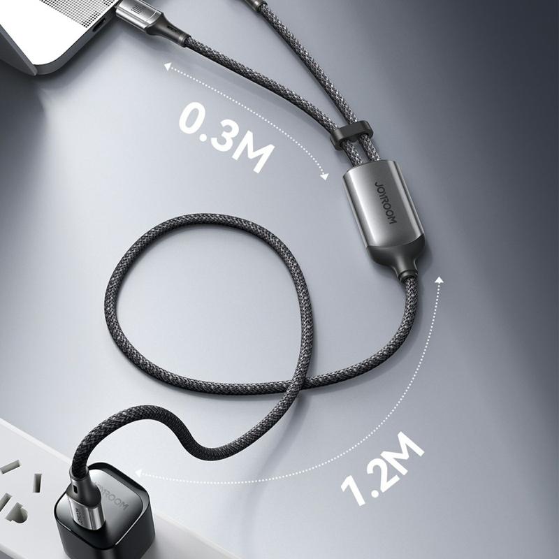 Kabel Joyroom S-A57 USB-C na podwójne USB-C - szybkie ładowanie 100 W z E-Markerem, synchronizacja danych 480 Mb/s, nylonowy oplot, opaska kablowa w zestawie