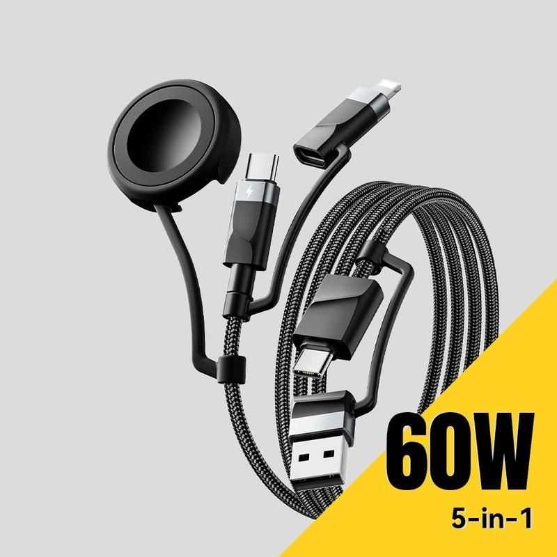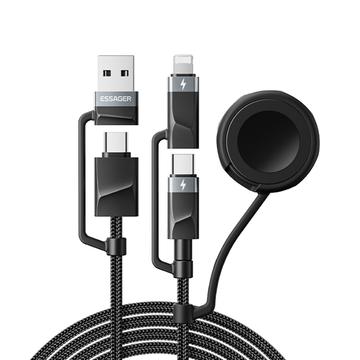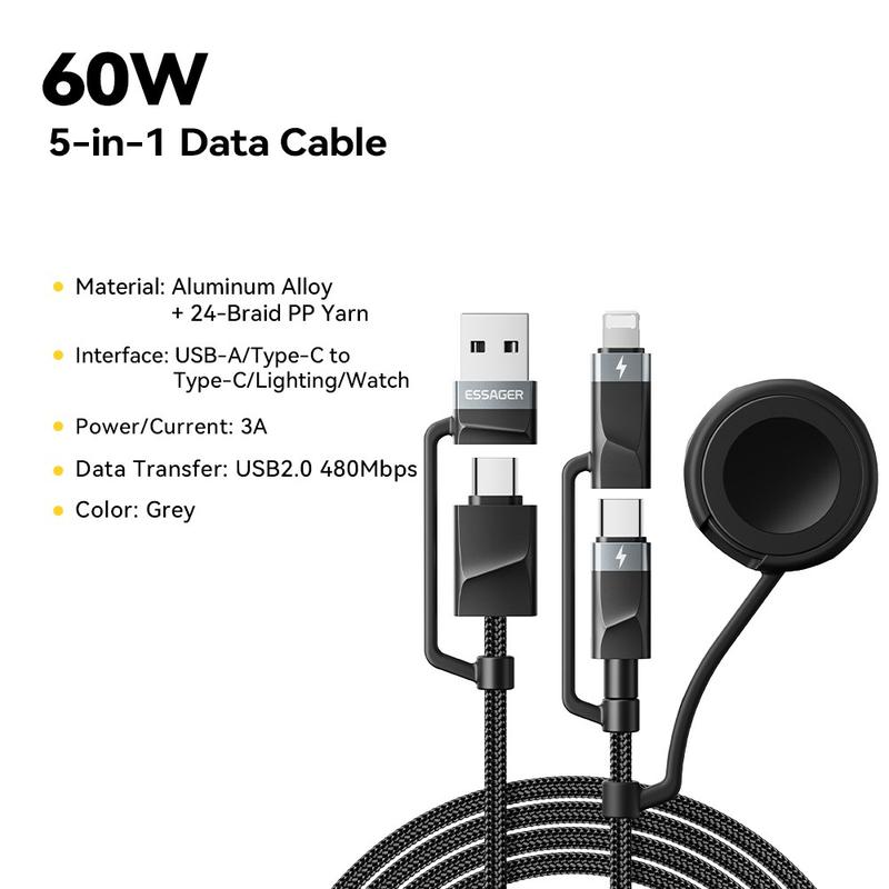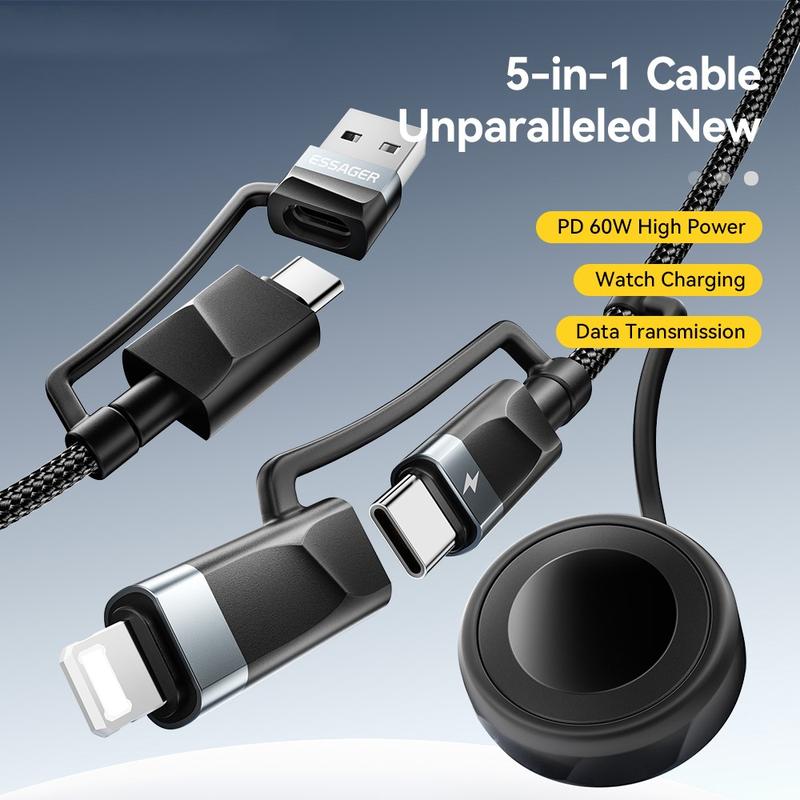 Kabel Essager 5 w 1 do szybkiego ładowania, 1m - kabel PD 60 W do ładowania wielu urządzeń z złączami USB-C, Lightning, USB-A i Apple Watch, synchronizacja danych 480 Mb/s