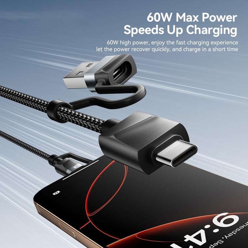 Obsługując ładowanie Power Delivery o mocy do 60 W, może szybko zasilać kompatybilne urządzenia USB-C, oferując jednocześnie niezawodne ładowanie innych obsługiwanych urządzeń. Trwałe złącza ze stopu aluminium i wzmocniona pleciona konstrukcja kabla poprawiają jego elastyczność i odporność na codzienne zużycie, dzięki czemu idealnie nadaje się do podróży, biura i codziennego użytku. Wbudowana taśma samoprzylepna pozwala utrzymać kabel w porządku, gdy nie jest używany.