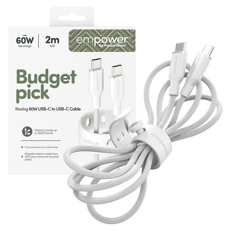 Kabel empower by PanzerGlass Racing USB-C do USB-C łączy w sobie szybkość, wygodę i trwałość. Jego niezwykle miękka powierzchnia sprawia, że korzystanie z niego na co dzień jest przyjemnością, a wzmocniona pleciona konstrukcja zapewnia odporność na intensywne użytkowanie. Dzięki szybkiemu ładowaniu 60W i zrównoważonym materiałom jest to niezawodny wybór, z którego można korzystać bez obaw.