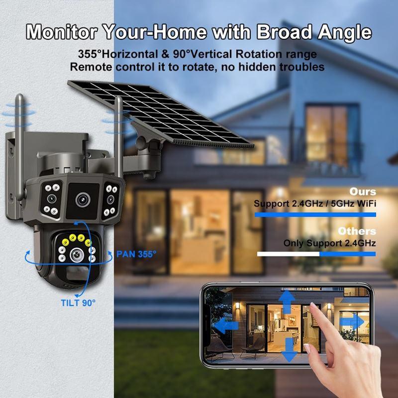 Zabezpiecz obszary zewnętrzne dzięki szerokiemu zasięgowi i mniejszej liczbie martwych punktów, korzystając z podwójnej kamery bezpieczeństwa QL18 zasilanej energią słoneczną. Zaprojektowana z myślą o łatwej bezprzewodowej konfiguracji w sieci Wi-Fi 2,4 GHz, łączy w sobie dwa obiektywy z kontrolą PTZ, dzięki czemu można monitorować kluczowe strefy i zdalnie dostosowywać widok po wykryciu aktywności. Rozdzielczość 2K (2560 x 1440) zapewnia ostrzejszy obraz wejść, podwórek, sadów i miejsc pracy, a kompresja H.265 pomaga zaoszczędzić miejsce na dysku bez utraty klarowności.