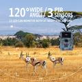 - Szeroki zakres wykrywania 120° - Trzy czujniki PIR obejmują szerokie pole widzenia, skutecznie wykrywając ruch zwierząt na dużych obszarach zewnętrznych.