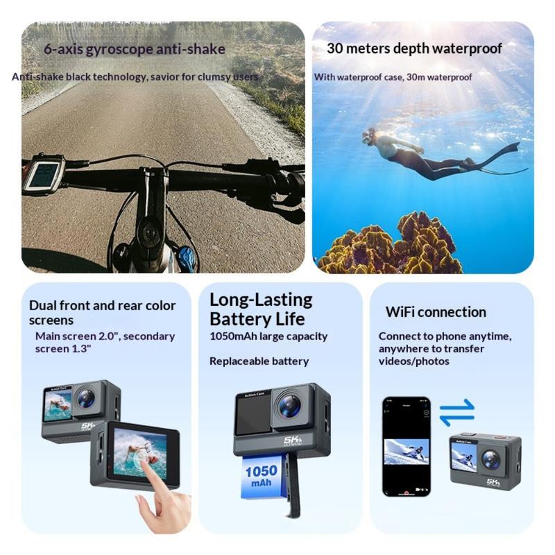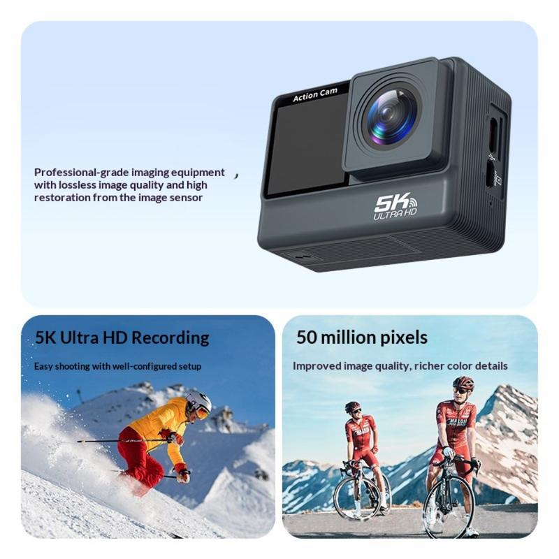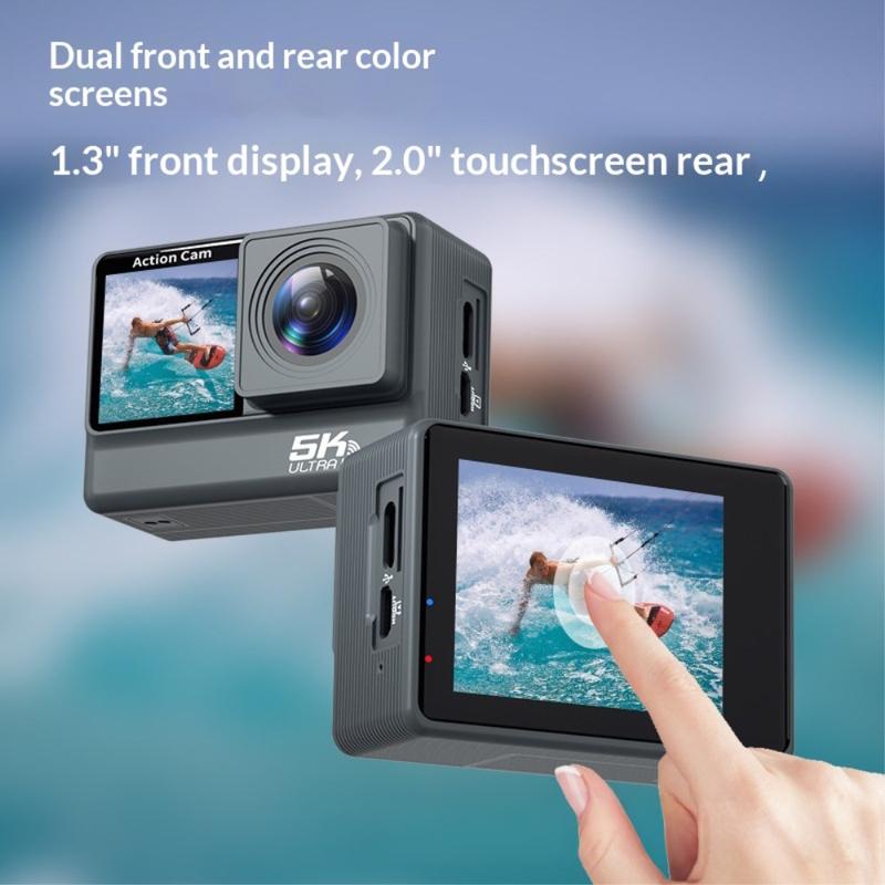 Kamera sportowa F308AATR z podwójnym ekranem - kamera sportowa 5K HD z 6-osiową stabilizacją, WiFi i wodoodpornym etui