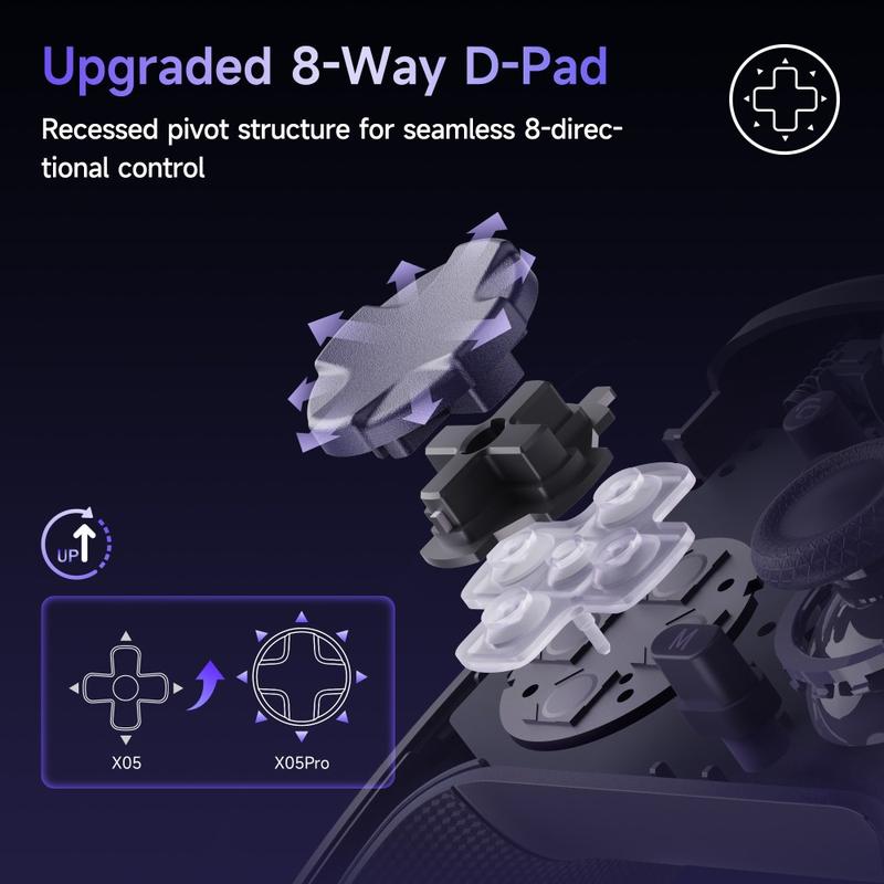 Joysticki z efektem Halla wykorzystują czujniki magnetyczne zamiast fizycznego kontaktu, eliminując zużycie i dryfowanie - funkcja często zarezerwowana dla wysokiej klasy profesjonalnych kontrolerów, teraz dostępna w X05Pro dla długotrwałej precyzji i trwałości.