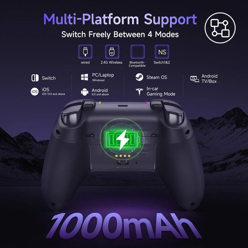 - Łączność w trzech trybach - Łatwe przełączanie między trybami bezprzewodowym 2,4 GHz, kompatybilnym z Bluetooth i przewodowym USB-C dla płynnej kompatybilności ze Switch, Windows, Android i iOS.