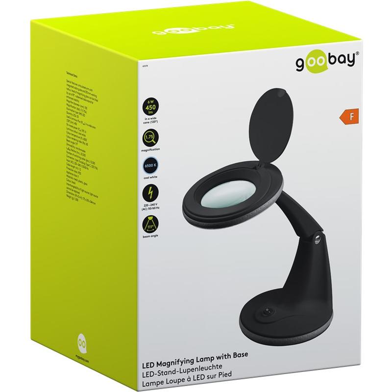 Lampa powiększająca LED Goobay z podstawą - światło pierścieniowe 6 W, szklana soczewka 100 mm, 1,75x (3 dioptrie), 450 lm, chłodna biel 6500 K, regulowane ramię (czarny)