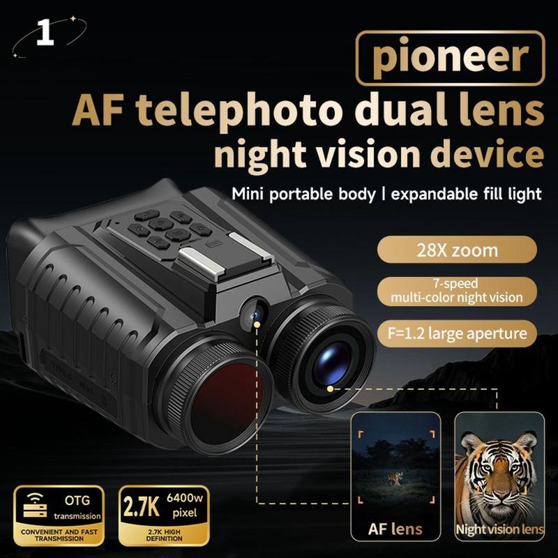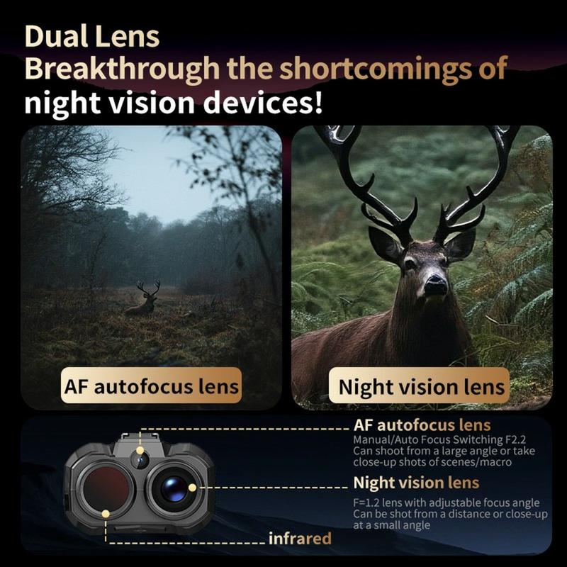 - Technologia podwójnego obiektywu: Łączy długoogniskowy obiektyw noktowizyjny z szerokokątnym obiektywem AF do fotografowania zarówno z bliska, jak i z daleka.