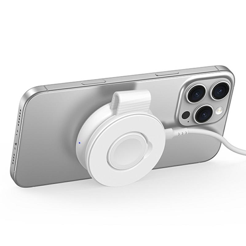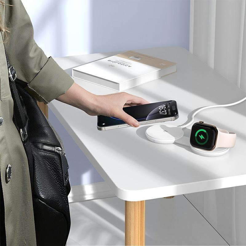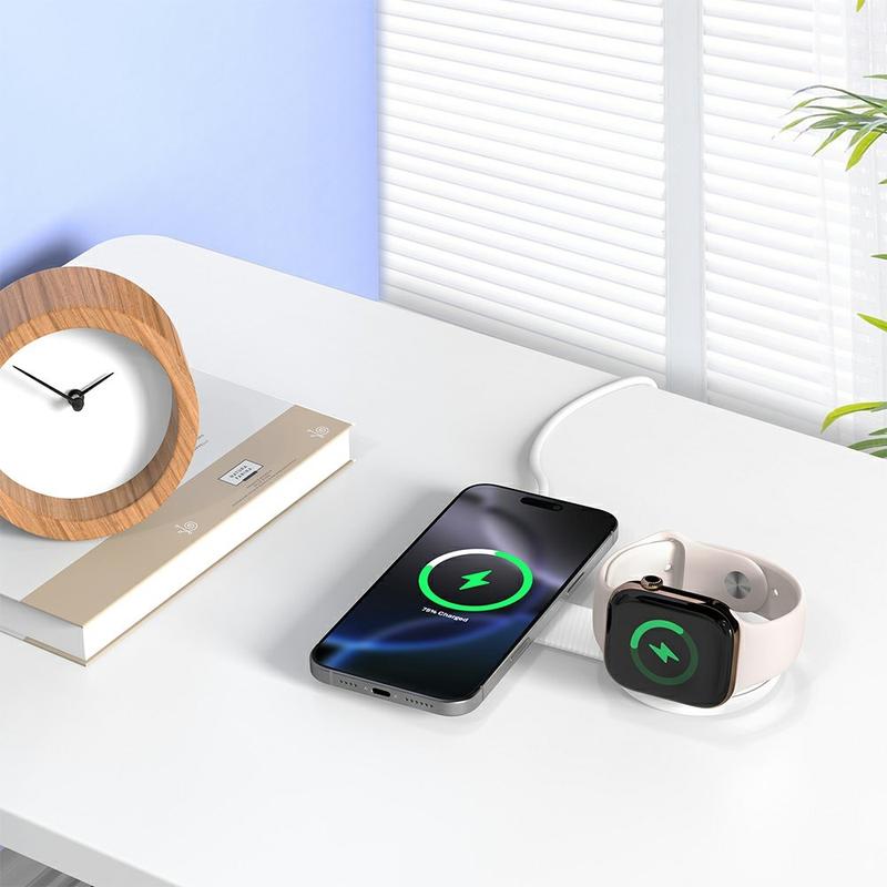 Obsługuje magnetyczne iPhone'y, etui MagSafe, Apple Watch i większość słuchawek zgodnych ze standardem Qi. Pojedyncza przenośna ładowarka, która upraszcza ładowanie wielu urządzeń.
