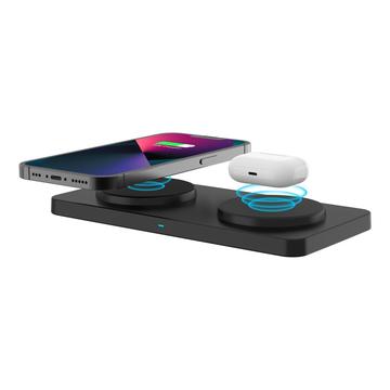 Uprość codzienne ładowanie dzięki magnetycznej ładowarce bezprzewodowej M15 2 w 1. Zaprojektowana z myślą o schludnym biurku lub stoliku nocnym, umożliwia jednoczesne ładowanie telefonu i bezprzewodowych słuchawek dousznych. Magnetyczne wyrównanie pomaga utrzymać kompatybilne telefony we właściwej pozycji, zapewniając bardziej stabilne ładowanie, a wzmocniona silikonem podstawa zwiększa przyczepność, zapobiegając ślizganiu się i chroniąc powierzchnie przed zarysowaniami.