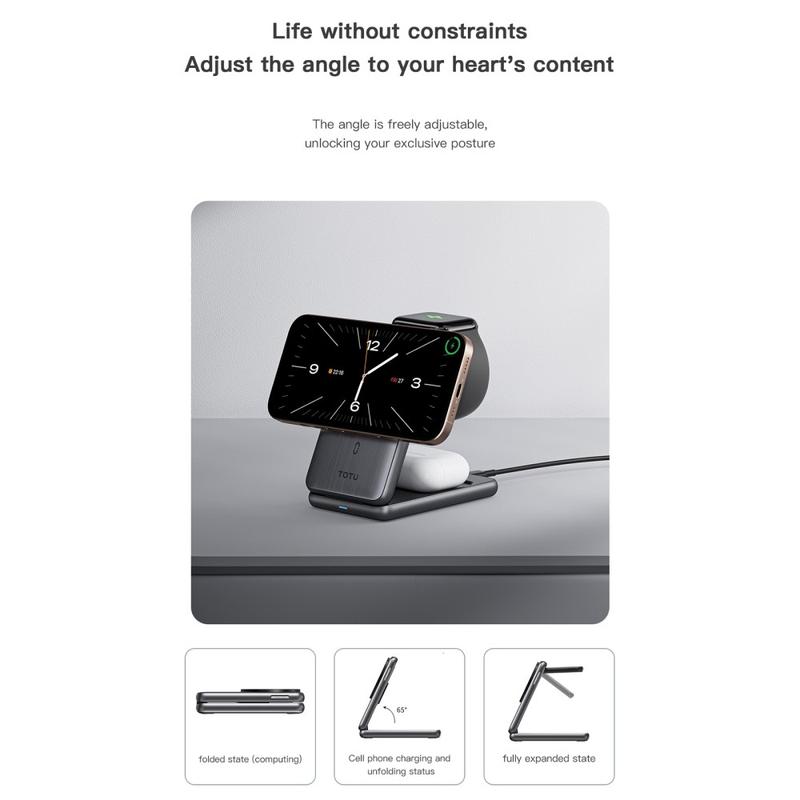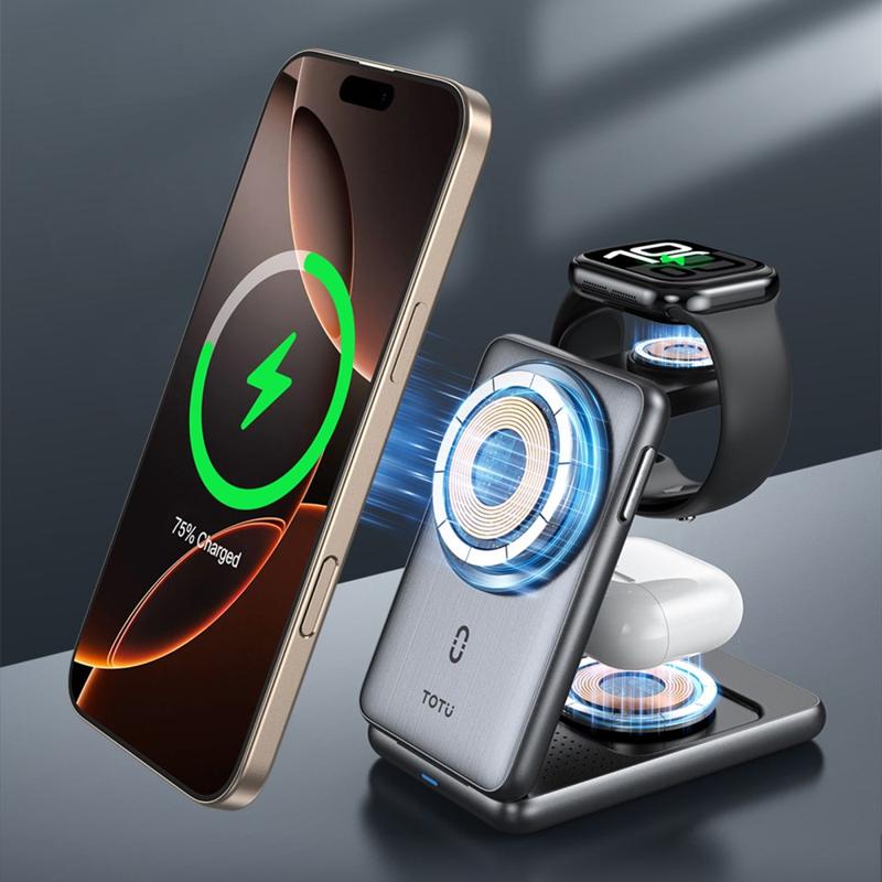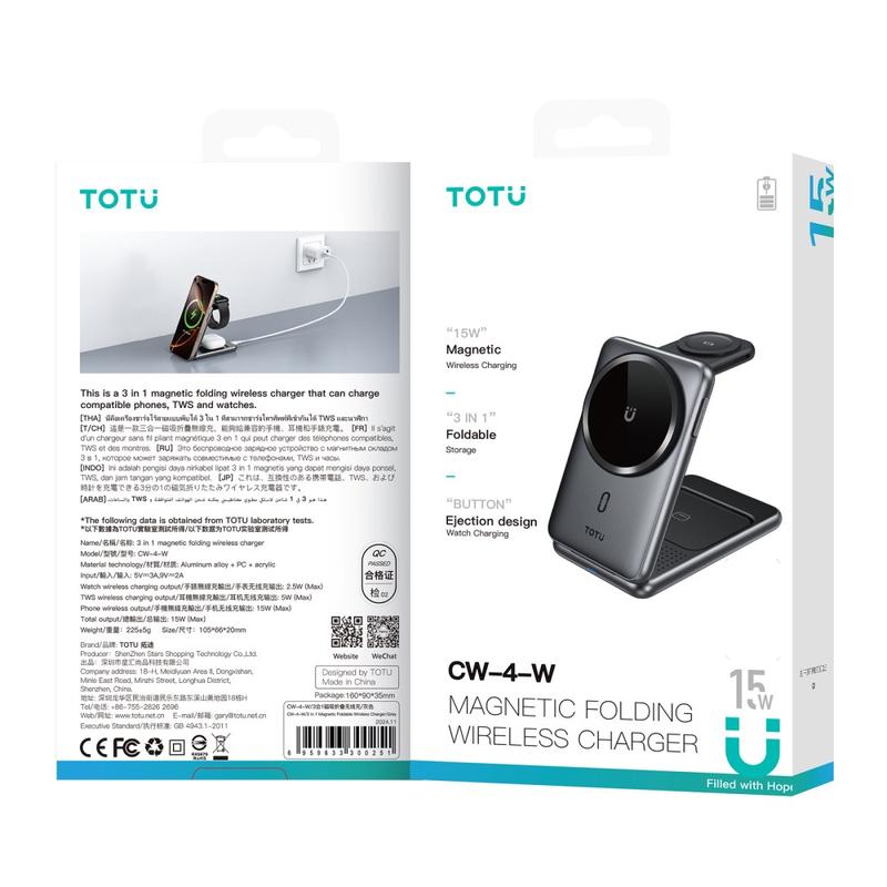 Bezprzewodowa stacja ładująca Totu CW-4-W 3 w 1 - magnetyczna składana ładowarka do telefonu, zegarka i słuchawek dousznych - szybkie ładowanie 15W