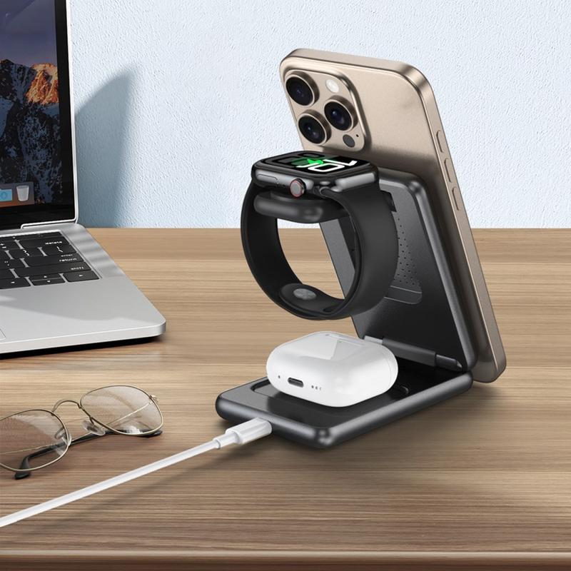 - Stacja ładująca 3 w 1 - Jednoczesne ładowanie telefonu, słuchawek i zegarka za pomocą jednego kompaktowego urządzenia.