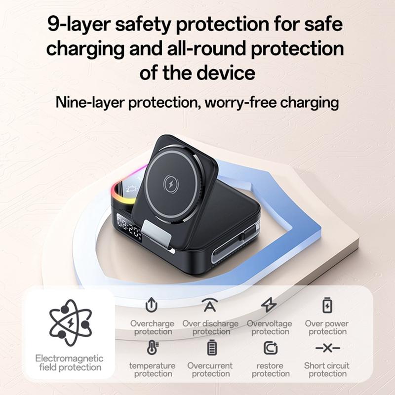 - Wielofunkcyjna konstrukcja 8 w 1 - integruje bezprzewodowe podkładki ładujące, porty szybkiego ładowania USB-A i USB-C, cyfrowy zegar LED i oświetlenie otoczenia RGB, zapewniając pełne wrażenia z ładowania.