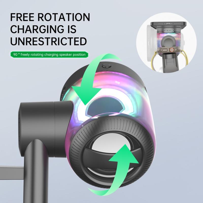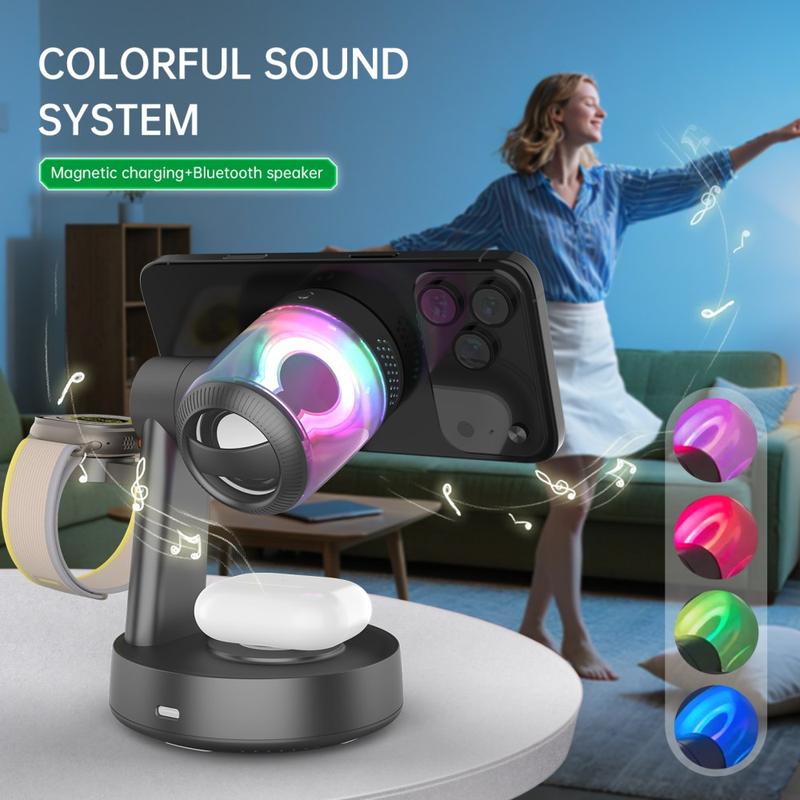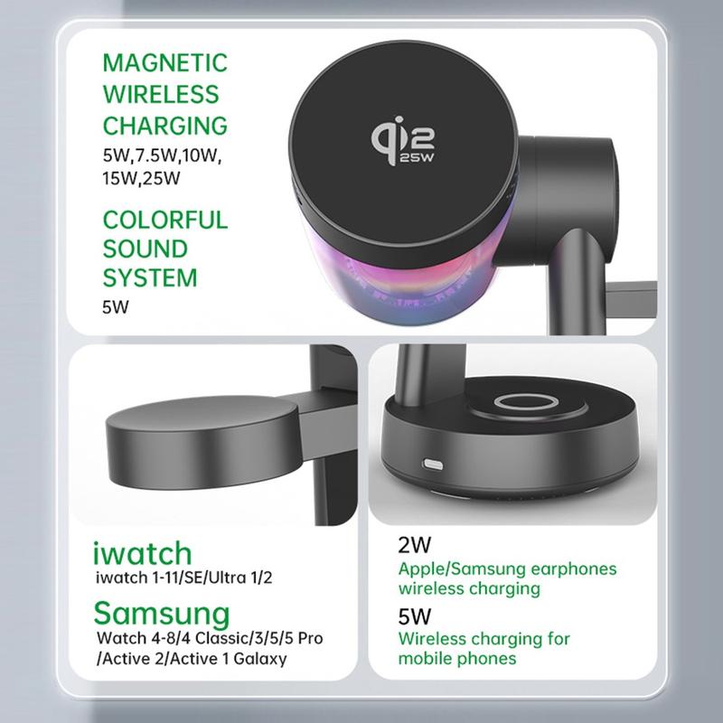 Magnetyczna bezprzewodowa stacja ładująca QI2.2 25W z głośnikiem Bluetooth i oświetleniem RGB - ładowarka 3 w 1 do telefonu, słuchawek i smartwatcha