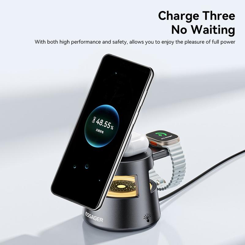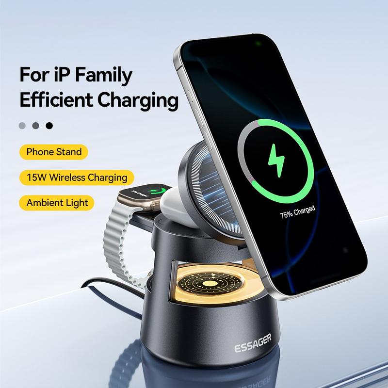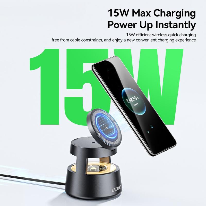 Ta ładowarka ESSAGER 4 w 1 łączy w sobie szybkie ładowanie, stabilność magnetyczną, delikatne oświetlenie i obsługę wielu urządzeń w jednej, oszczędzającej miejsce konstrukcji - idealnej do użytku domowego, biurowego lub przy łóżku.