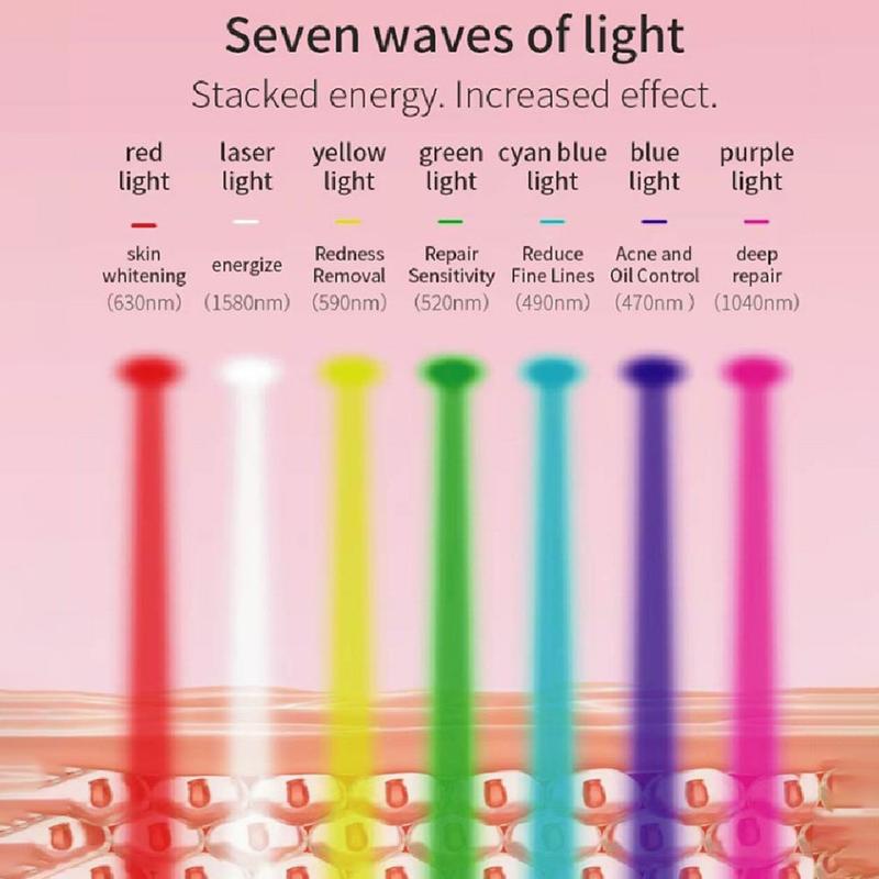 - 7-kolorowa terapia LED - obejmuje czerwone (630nm), niebieskie (460nm), zielone (515nm), fioletowe, żółto-pomarańczowe, cyjanowe i białe światło, które działa na wiele problemów skórnych.
