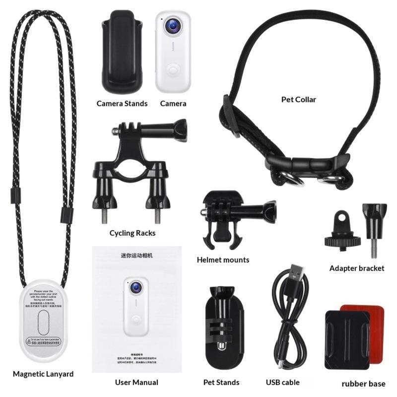 - W zestawie znajduje się wiele uchwytów do montażu na zwierzętach, rowerach, kaskach i ubraniach