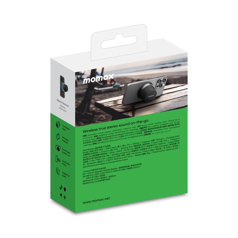 Magnetyczny mini głośnik Bluetooth MOMAX 1-Vibe Go BS6 to kompaktowe, wszechstronne rozwiązanie audio przeznaczone do codziennej rozrywki w domu lub w podróży. Jego ultra-mini magnetyczna konstrukcja łączy w sobie przenośny głośnik bezprzewodowy z praktyczną podstawką pod telefon, umożliwiając łatwe korzystanie z muzyki, filmów i połączeń telefonicznych. Wyposażony w potężny przetwornik 40 mm i 360° wyjście dźwięku, zapewnia wciągający dźwięk w zaskakująco małej obudowie, a wodoodporność IPX6 sprawia, że nadaje się do codziennego użytku w różnych środowiskach.