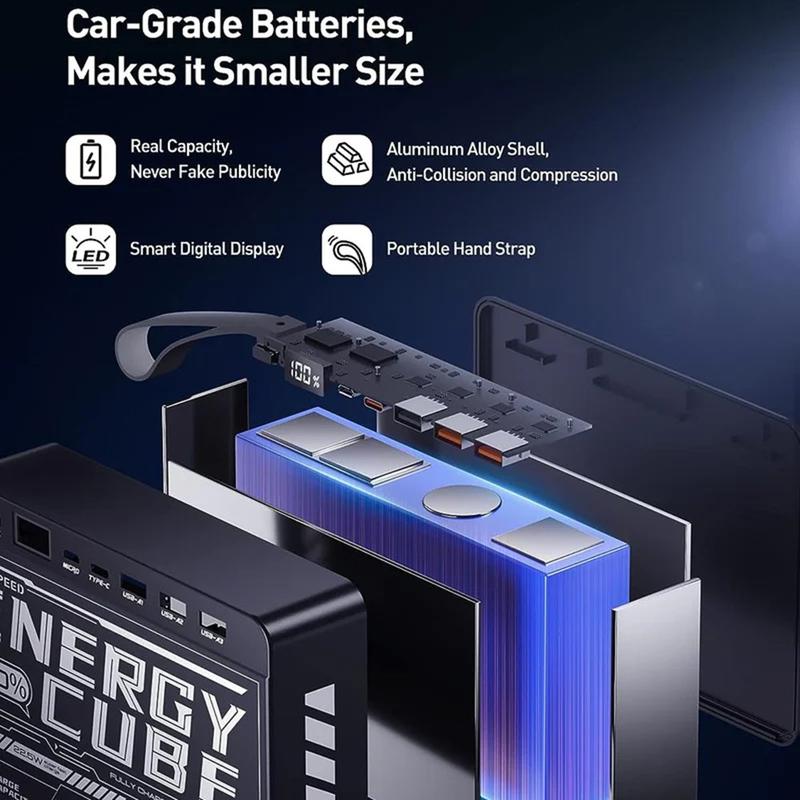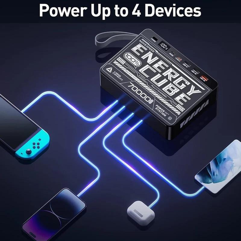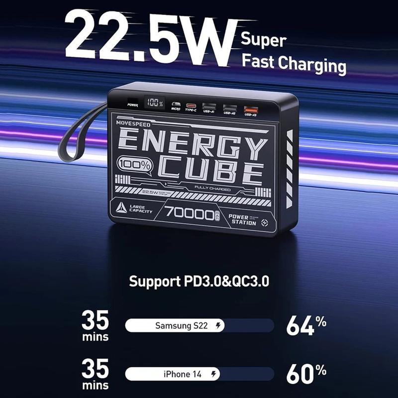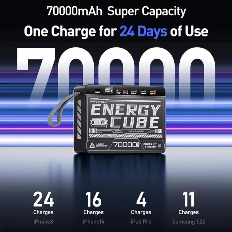 Zasilaj wszystko i wszędzie dzięki powerbankowi Movespeed YSPBZ70-22K, przenośnej ładowarce o dużej pojemności 70000mAh, zaprojektowanej z myślą o najwyższej wytrzymałości i szybkości. Wyposażony w wiele portów szybkiego ładowania i odważny design inspirowany mecha, został stworzony, aby zapewnić zasilanie urządzeń przez wiele dni - niezależnie od tego, czy jesteś na kempingu, w podróży, czy pracujesz zdalnie.