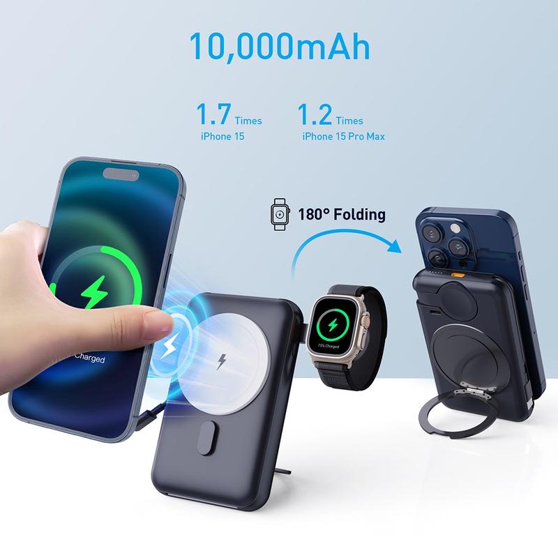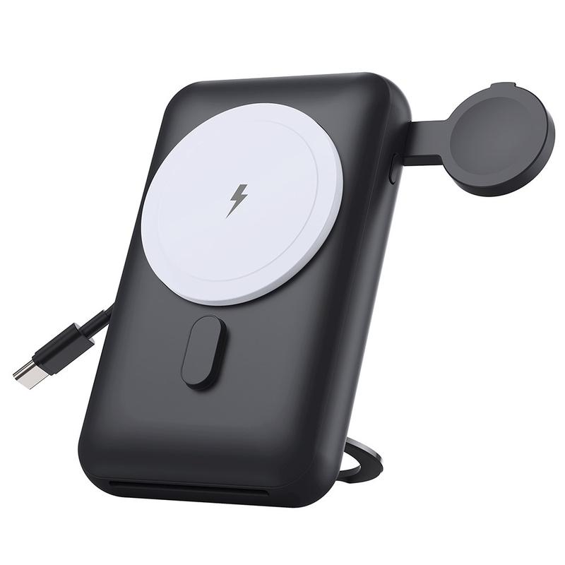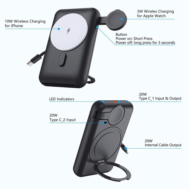 MP07 - magnetyczny power bank 3 w 1 o pojemności 10000mAh - kompatybilny z MagSafe, bezprzewodowa ładowarka z wbudowanym kablem i obrotową podstawką do iPhone'a, AirPods i Apple Watch