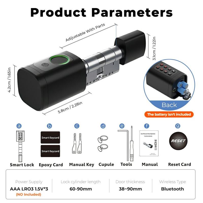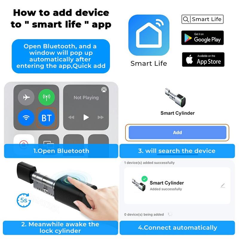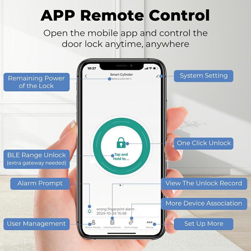 W przeciwieństwie do tradycyjnego cylindra zamka, ten inteligentny model posiada wbudowany chip obsługujący parowanie Bluetooth. Po podłączeniu przez kompatybilną bramkę Bluetooth można nim zarządzać zdalnie za pomocą aplikacji Tuya lub Smart Life. Aplikacja pozwala przeglądać rejestry odblokowań, sprawdzać, kto i kiedy uzyskał dostęp do zamka, oraz tworzyć tymczasowe hasła dla gości, odwiedzających, sprzątaczy lub usługodawców. Zapewnia to większą kontrolę, wygodę i przejrzystość w codziennym zarządzaniu dostępem.