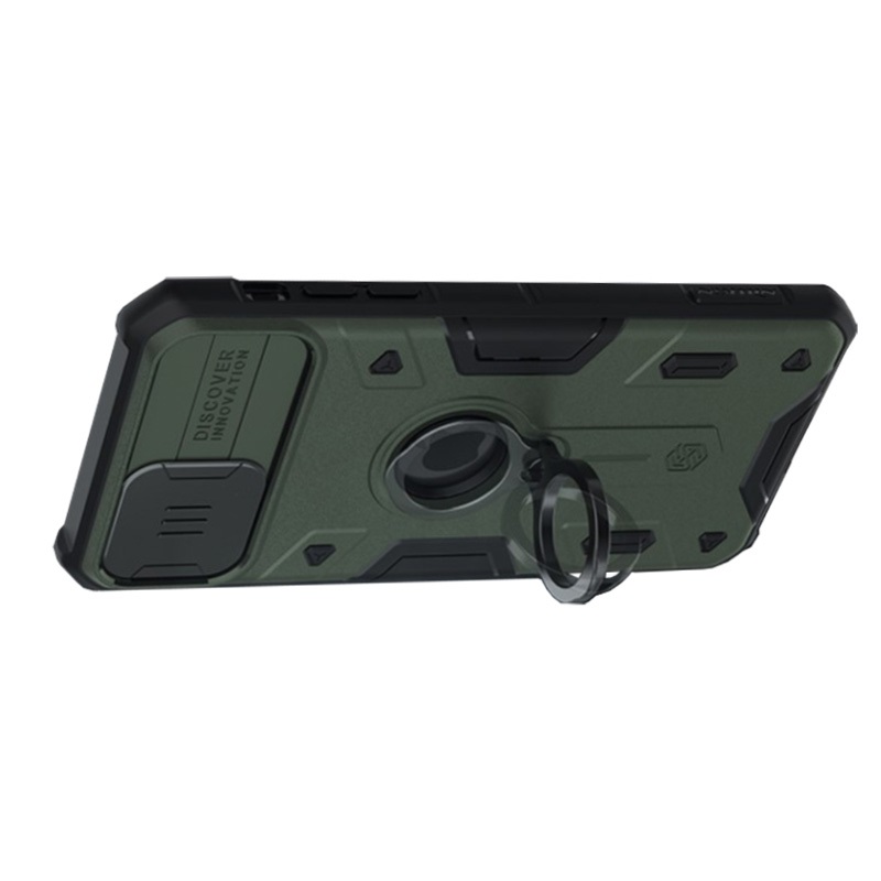 Etui Nillkin CamShield Armor do telefonu iPhone 11 posiada przeciwpoślizgową teksturę i mocny poliwęglanowy materiał, które niezawodnie ochronią smartfon podczas ekstremalnych aktywności na świeżym powietrzu. Etui jest ponadto wyposażone w rozsuwaną osłonę na aparat i uchwyt pierścieniowy z obrotem w zakresie 360 stopni, który może być używany do wygodnego trzymania lub oglądania multimediów.