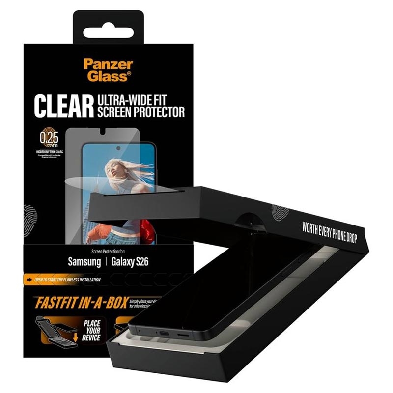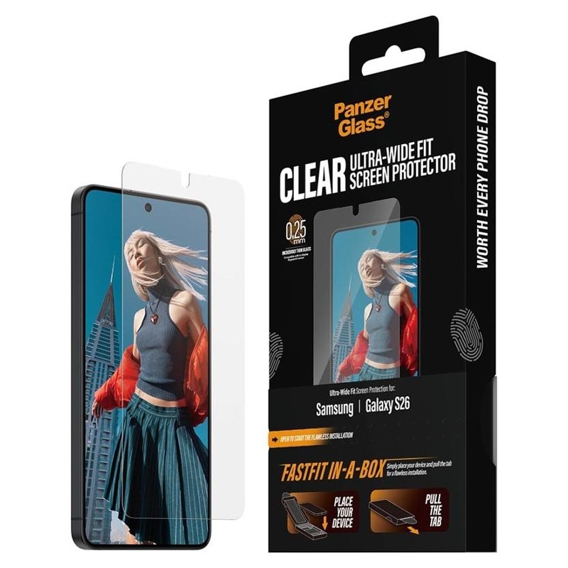 Ochraniacz ekranu PanzerGlass Ultra-Wide Fit do Samsung Galaxy S26 został zaprojektowany z myślą o szybkiej instalacji bez pęcherzyków powietrza dzięki innowacyjnemu systemowi FASTFIT IN-A-BOX. Wystarczy umieścić Samsung Galaxy S26 ekranem do góry, pociągnąć za zakładkę i cieszyć się idealnie dopasowanym zabezpieczeniem za każdym razem - bez kurzu i frustracji.