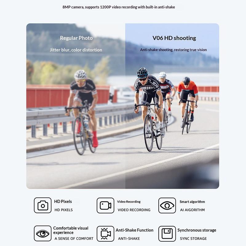 Inteligentne okulary V06 AI wykorzystują zaawansowaną technologię poprawy jakości obrazu, aby ulepszyć nagrania w rzeczywistych warunkach. Funkcje takie jak rozjaśnianie przy słabym oświetleniu, rozmycie tła i redukcja szumów w wielu klatkach pomagają uzyskać wyraźniejszy, bardziej zrównoważony materiał filmowy — idealny do aktywności na świeżym powietrzu i codziennych chwil.